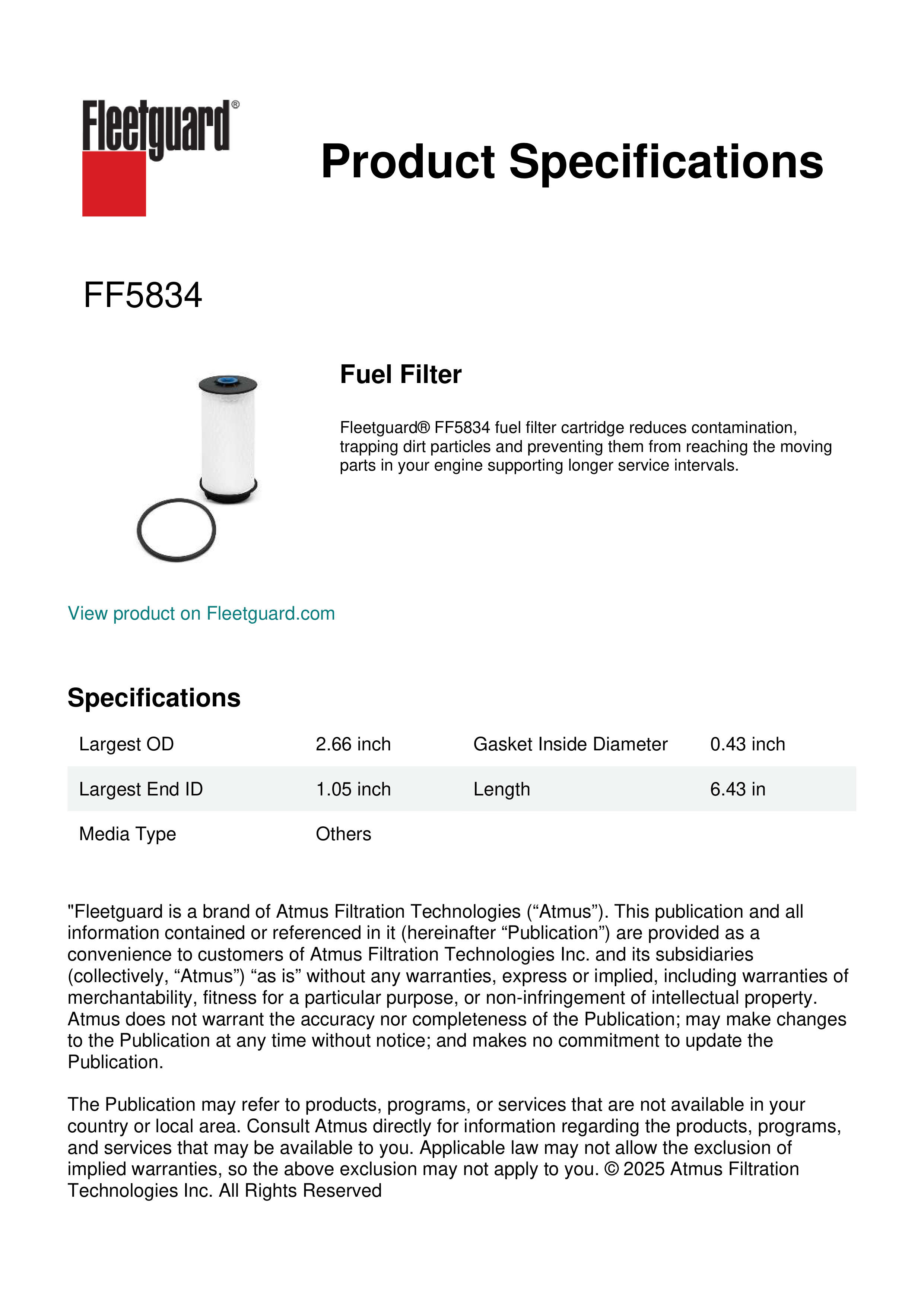 Fleetguard® FF5834 fuel filter cartridge reduces contamination, trapping dirt particles and preventing them from reaching the moving parts in your engine supporting longer service intervals.Specification
