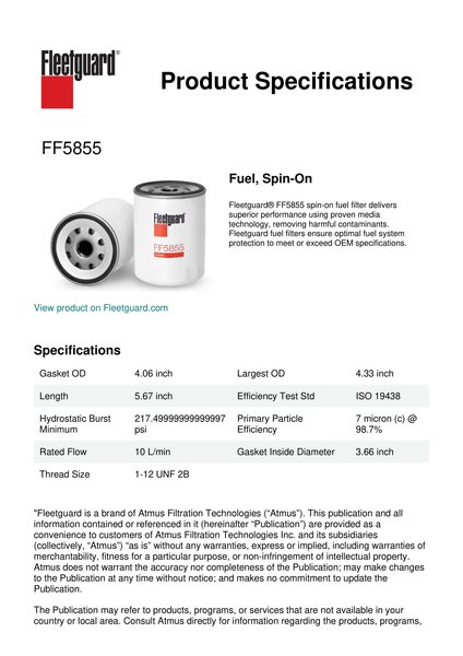 Fleetguard® FF5855 spin-on fuel filter delivers superior performance using proven media technology, removing harmful contaminants. Fleetguard fuel filters ensure optimal fuel system protection to meet or exceed OEM specifications.Specification