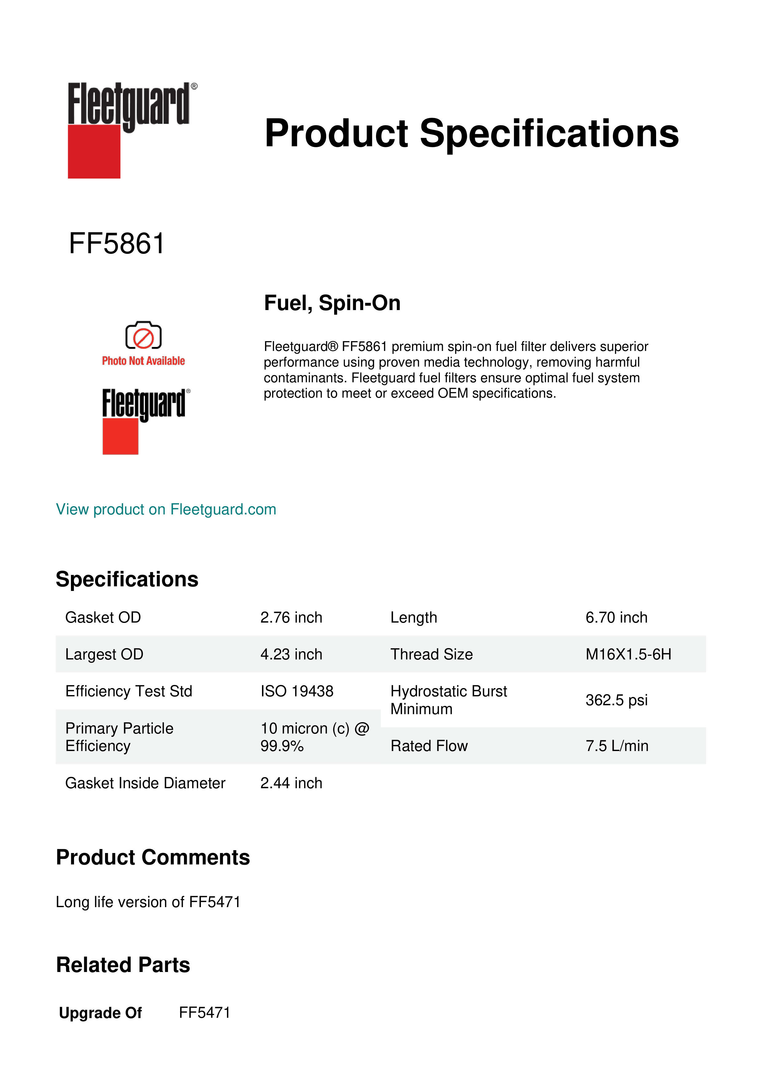 Fleetguard® FF5861 premium spin-on fuel filter delivers superior performance using proven media technology, removing harmful contaminants. Fleetguard fuel filters ensure optimal fuel system protection to meet or exceed OEM specifications.Specification