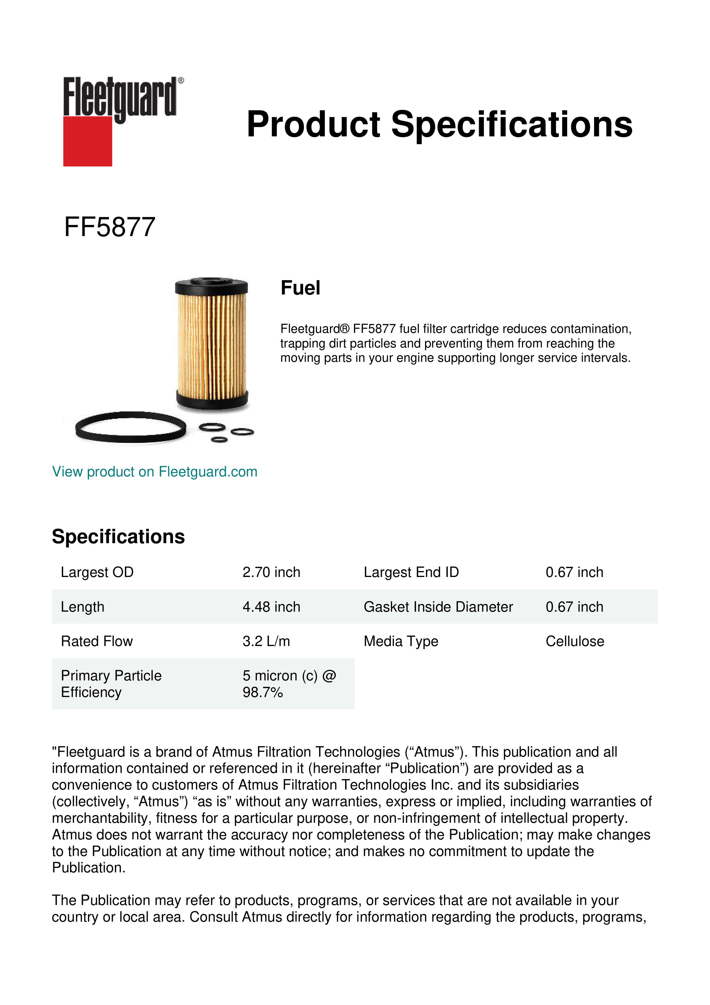 Fleetguard® FF5877 fuel filter cartridge reduces contamination, trapping dirt particles and preventing them from reaching the moving parts in your engine supporting longer service intervals.Specification