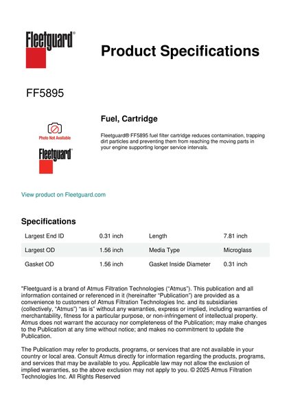 Fleetguard® FF5895 fuel filter cartridge reduces contamination, trapping dirt particles and preventing them from reaching the moving parts in your engine supporting longer service intervals.Specification