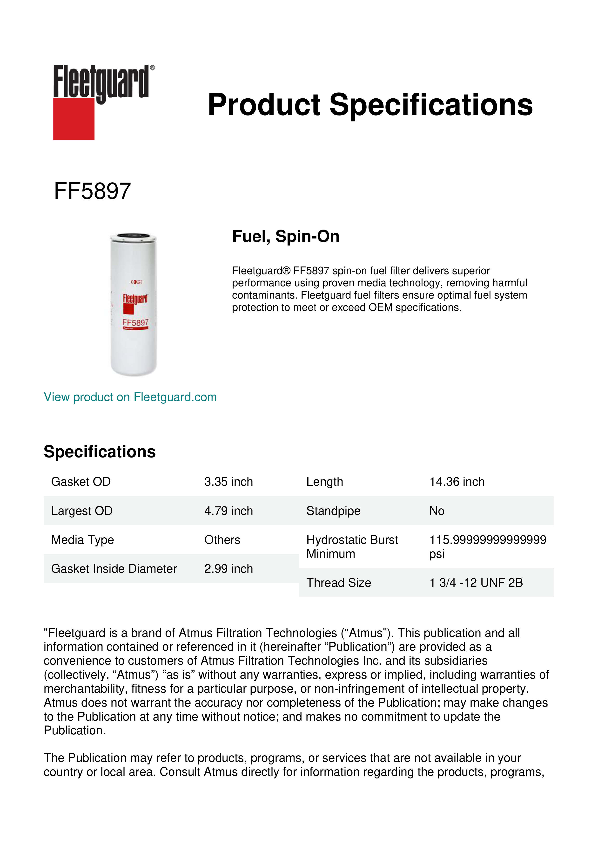 Fleetguard® FF5897 spin-on fuel filter delivers superior performance using proven media technology, removing harmful contaminants. Fleetguard fuel filters ensure optimal fuel system protection to meet or exceed OEM specifications.Specification
