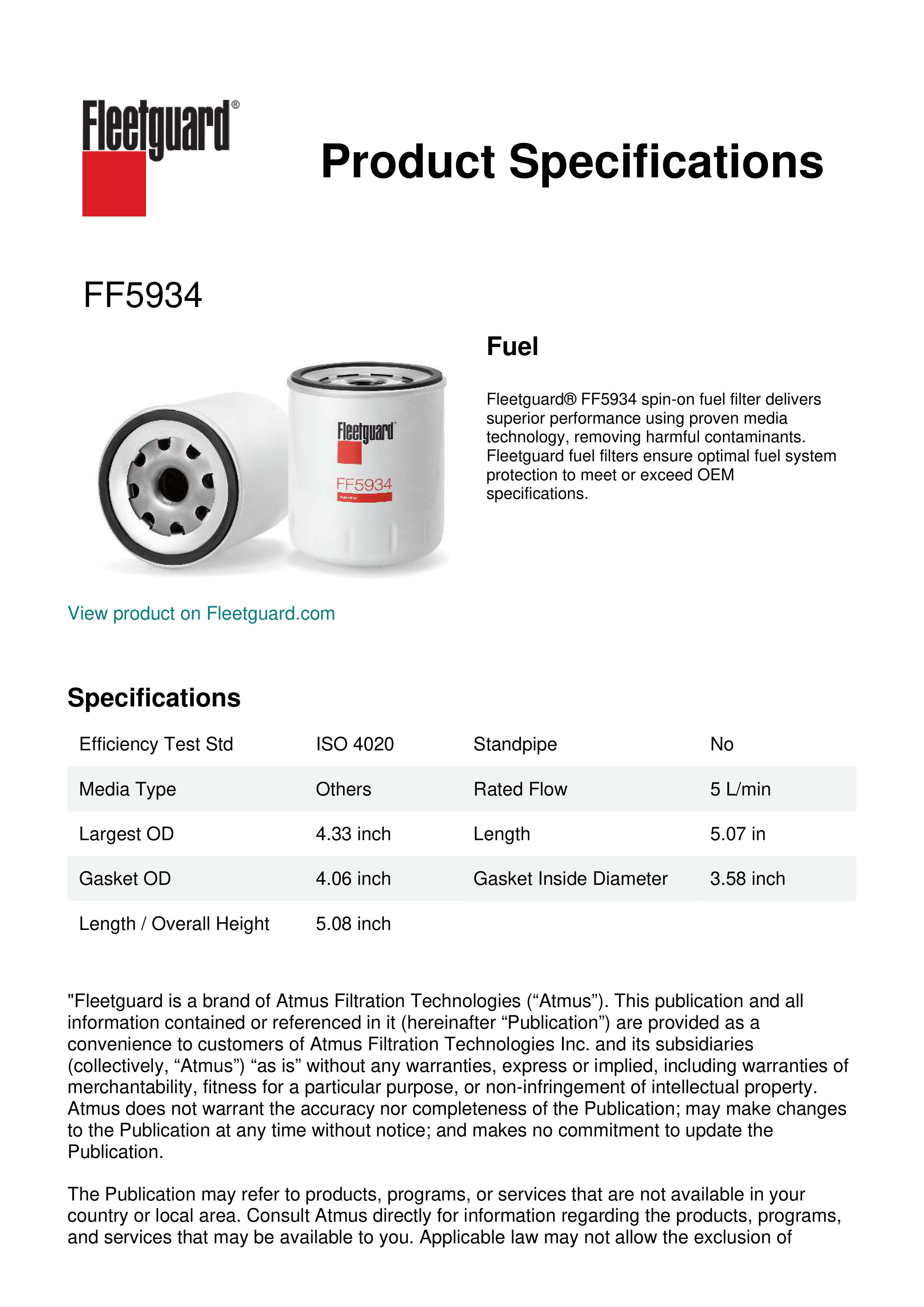 Fleetguard® FF5934 spin-on fuel filter delivers superior performance using proven media technology, removing harmful contaminants. Fleetguard fuel filters ensure optimal fuel system protection to meet or exceed OEM specifications.Specification