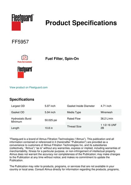 Fleetguard® FF5957 spin-on lube filter meets or exceeds OE performance requirements and the new challenges of modern engine technology.Specification