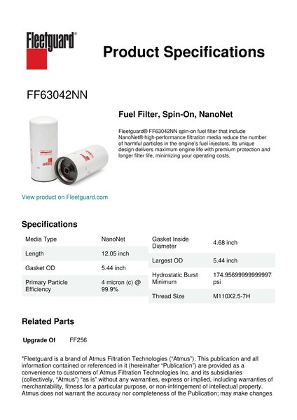 Fleetguard® FF63042NN spin-on fuel filter that include NanoNet® high-performance filtration media reduce the number of harmful particles in the engine’s fuel injectors. Its unique design delivers maximum engine life with premium protection and longer filter life, minimizing your operating costs.Specification