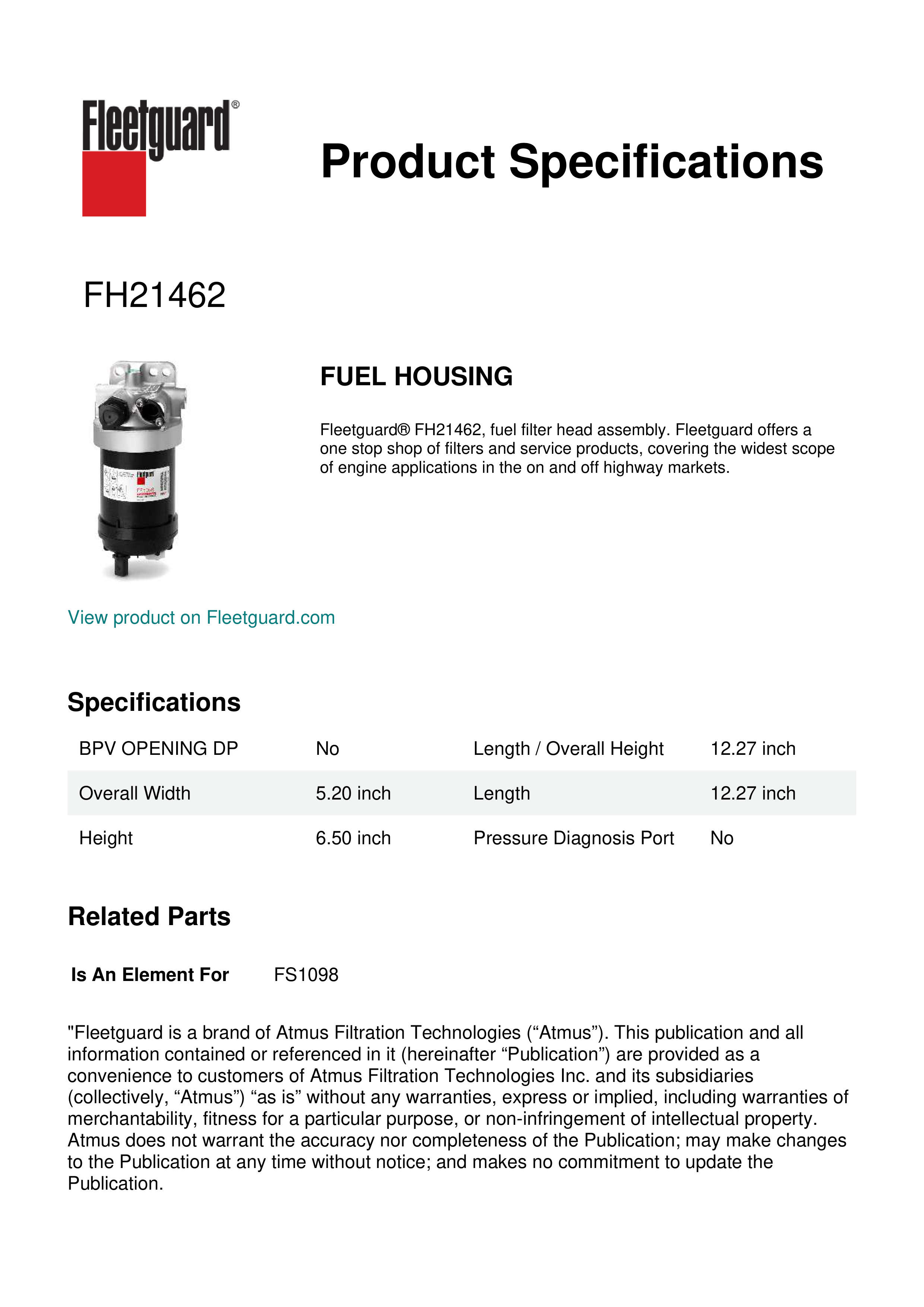 Fleetguard® FH21462, fuel filter head assembly. Fleetguard offers a one stop shop of filters and service products, covering the widest scope of engine applications in the on and off highway markets.Specification