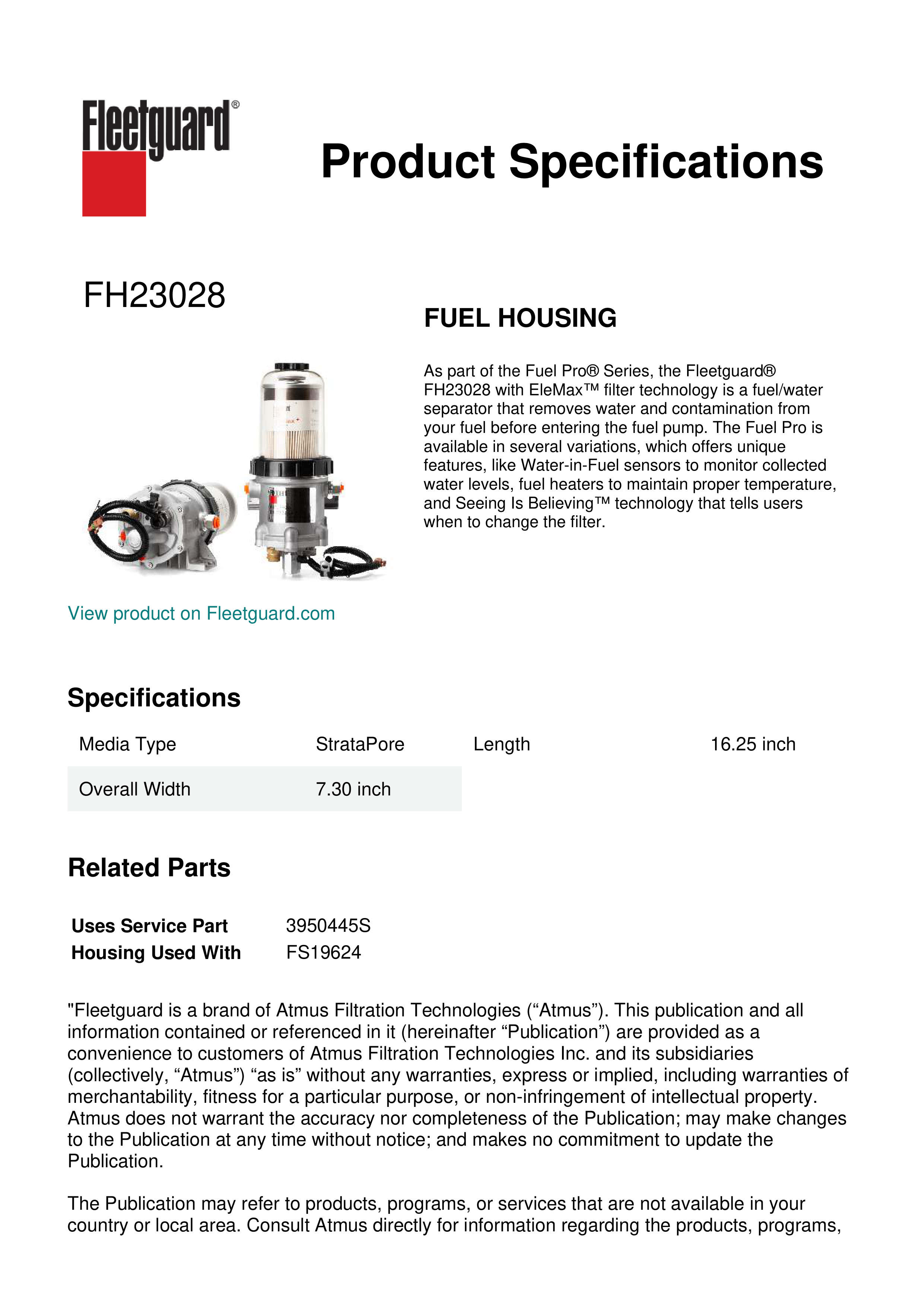 As part of the Fuel Pro® Series, the Fleetguard® FH23028 with EleMax™ filter technology is a fuel/water separator that removes water and contamination from your fuel before entering the fuel pump. The Fuel Pro is available in several variations, which offers unique features, like Water-in-Fuel sensors to monitor collected water levels, fuel heaters to maintain proper temperature, and Seeing Is Believing™ technology that tells users when to change the filter.Specification