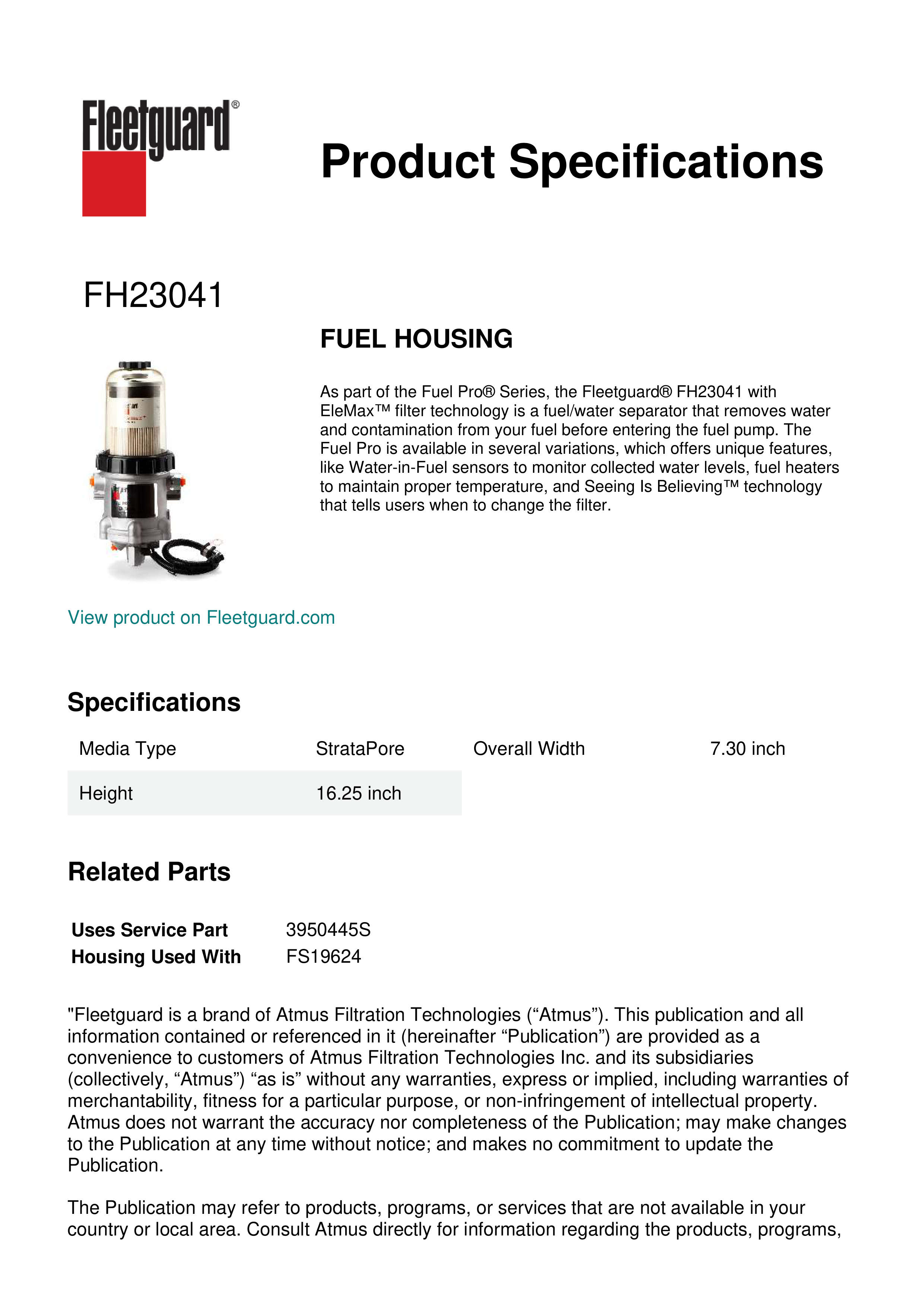 As part of the Fuel Pro® Series, the Fleetguard® FH23041 with EleMax™ filter technology is a fuel/water separator that removes water and contamination from your fuel before entering the fuel pump. The Fuel Pro is available in several variations, which offers unique features, like Water-in-Fuel sensors to monitor collected water levels, fuel heaters to maintain proper temperature, and Seeing Is Believing™ technology that tells users when to change the filter.