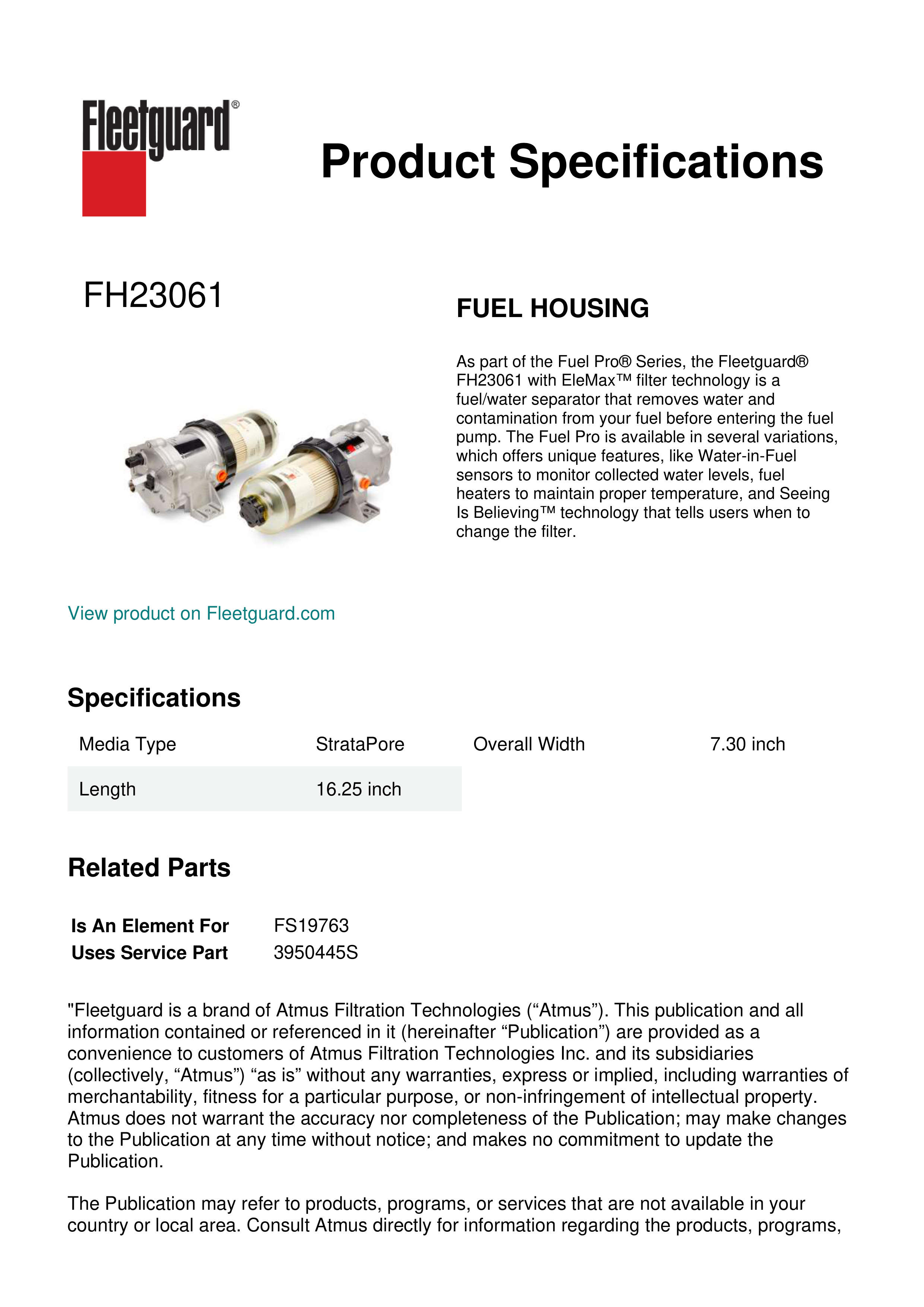 As part of the Fuel Pro® Series, the Fleetguard® FH23061 with EleMax™ filter technology is a fuel/water separator that removes water and contamination from your fuel before entering the fuel pump. The Fuel Pro is available in several variations, which offers unique features, like Water-in-Fuel sensors to monitor collected water levels, fuel heaters to maintain proper temperature, and Seeing Is Believing™ technology that tells users when to change the filter.Specification