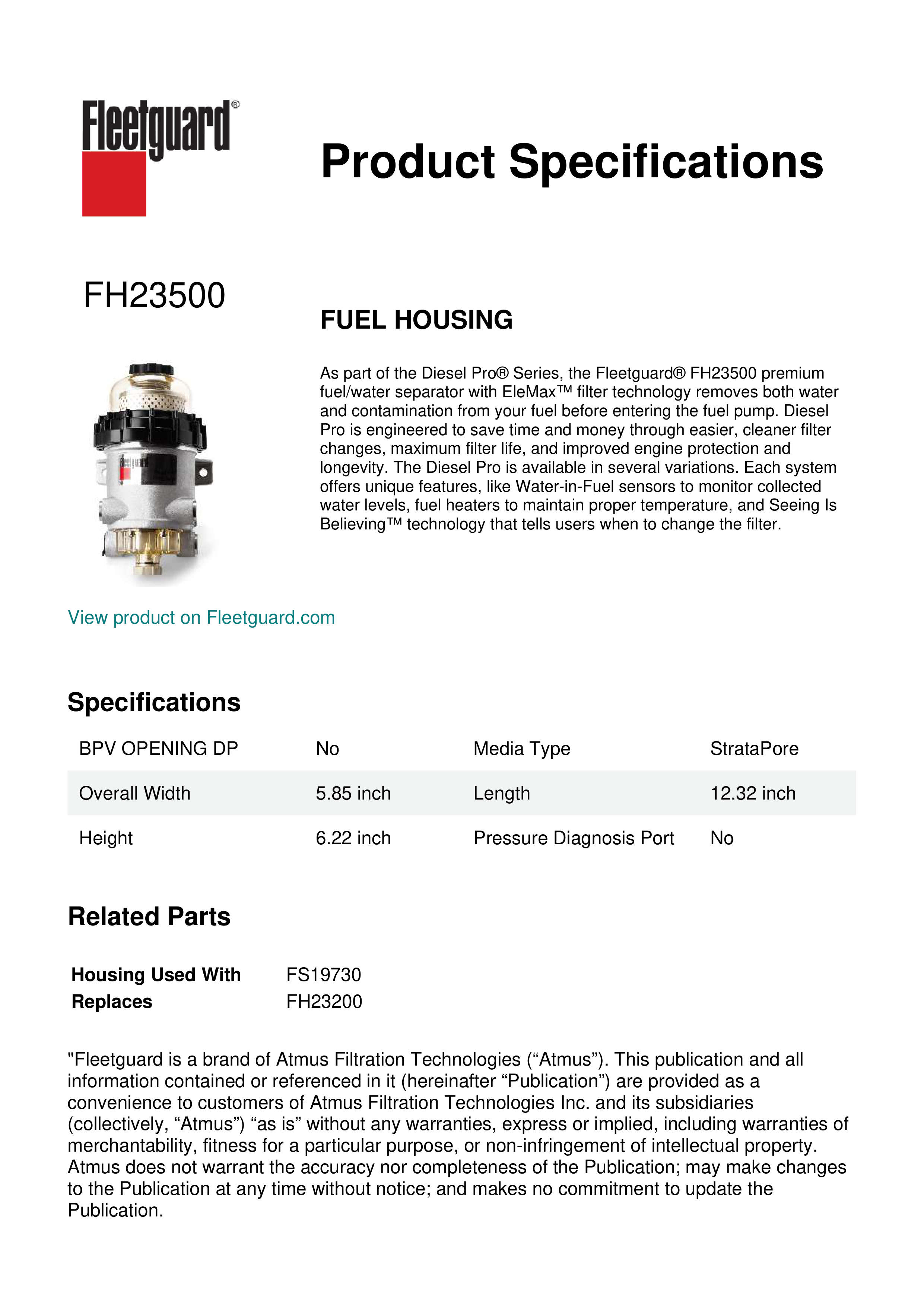 As part of the Diesel Pro® Series, the Fleetguard® FH23500 premium fuel/water separator with EleMax™ filter technology removes both water and contamination from your fuel before entering the fuel pump. Diesel Pro is engineered to save time and money through easier, cleaner filter changes, maximum filter life, and improved engine protection and longevity. The Diesel Pro is available in several variations. Each system offers unique features, like Water-in-Fuel sensors to monitor collected water levels, fuel heaters to maintain proper temperature, and Seeing Is Believing™ technology that tells users when to change the filter.Specification