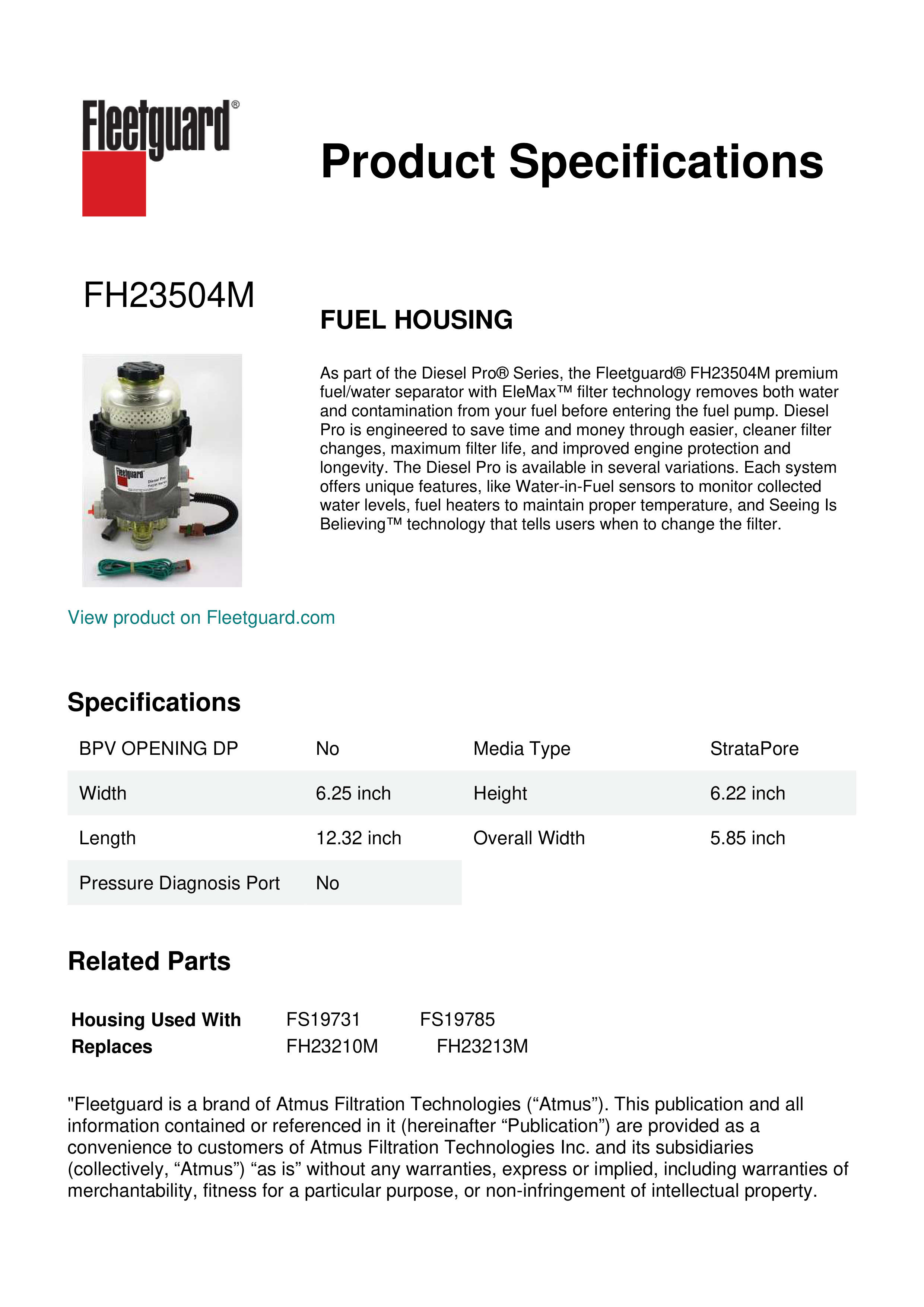 As part of the Diesel Pro® Series, the Fleetguard® FH23504M premium fuel/water separator with EleMax™ filter technology removes both water and contamination from your fuel before entering the fuel pump. Diesel Pro is engineered to save time and money through easier, cleaner filter changes, maximum filter life, and improved engine protection and longevity. The Diesel Pro is available in several variations. Each system offers unique features, like Water-in-Fuel sensors to monitor collected water levels, fuel heaters to maintain proper temperature, and Seeing Is Believing™ technology that tells users when to change the filter.Specification
