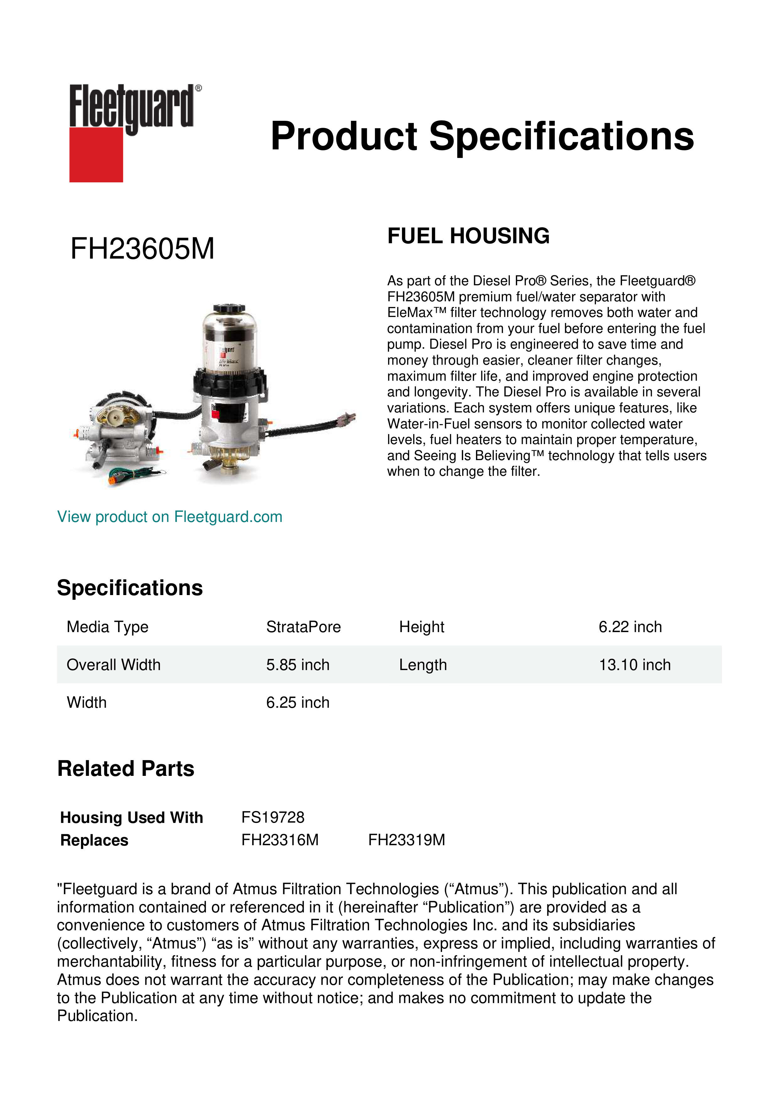 As part of the Diesel Pro® Series, the Fleetguard® FH23605M premium fuel/water separator with EleMax™ filter technology removes both water and contamination from your fuel before entering the fuel pump. Diesel Pro is engineered to save time and money through easier, cleaner filter changes, maximum filter life, and improved engine protection and longevity. The Diesel Pro is available in several variations. Each system offers unique features, like Water-in-Fuel sensors to monitor collected water levels, fuel heaters to maintain proper temperature, and Seeing Is Believing™ technology that tells users when to change the filter.Specification