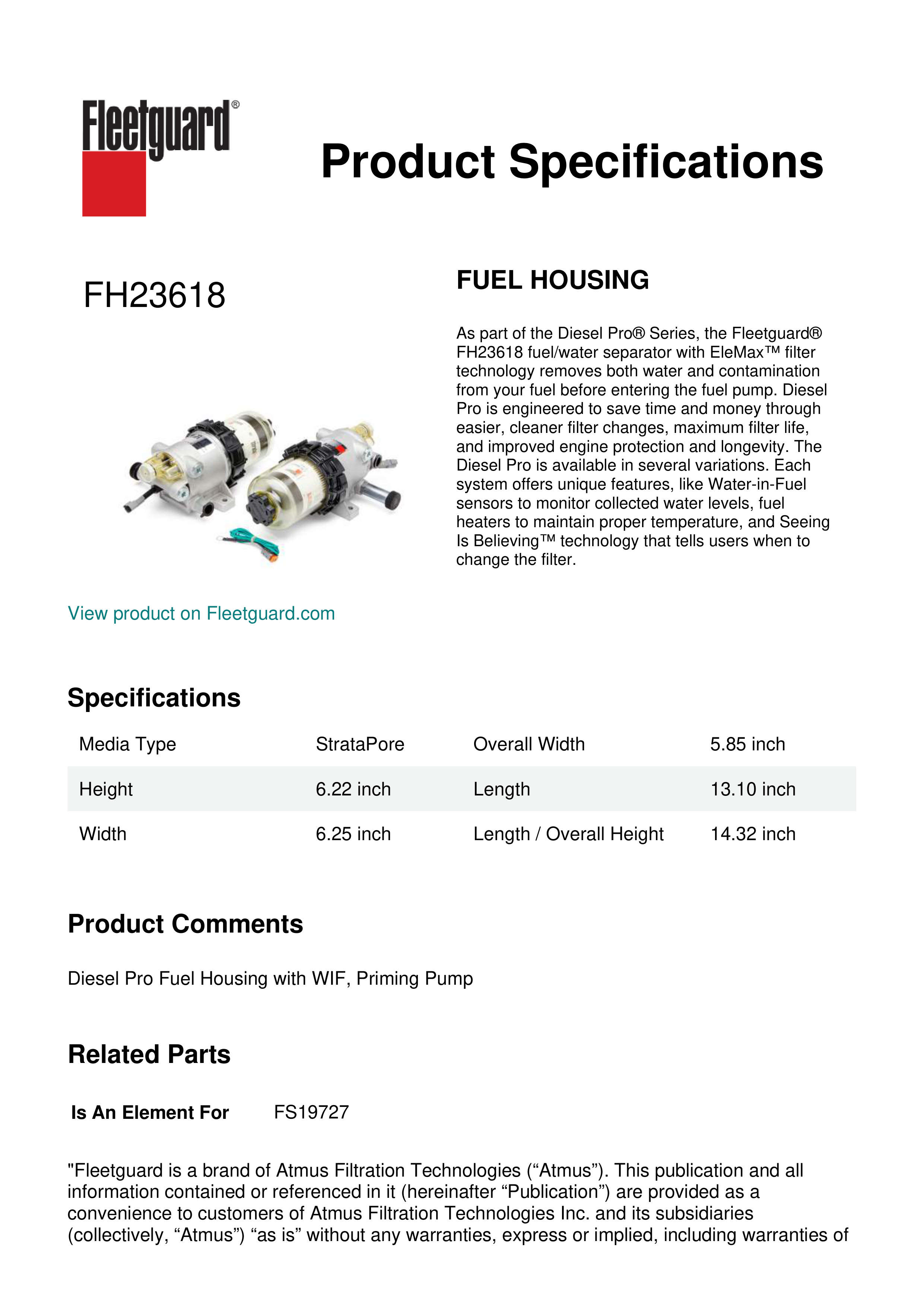 As part of the Diesel Pro® Series, the Fleetguard® FH23618 fuel/water separator with EleMax™ filter technology removes both water and contamination from your fuel before entering the fuel pump. Diesel Pro is engineered to save time and money through easier, cleaner filter changes, maximum filter life, and improved engine protection and longevity. The Diesel Pro is available in several variations. Each system offers unique features, like Water-in-Fuel sensors to monitor collected water levels, fuel heaters to maintain proper temperature, and Seeing Is Believing™ technology that tells users when to change the filter.Specification