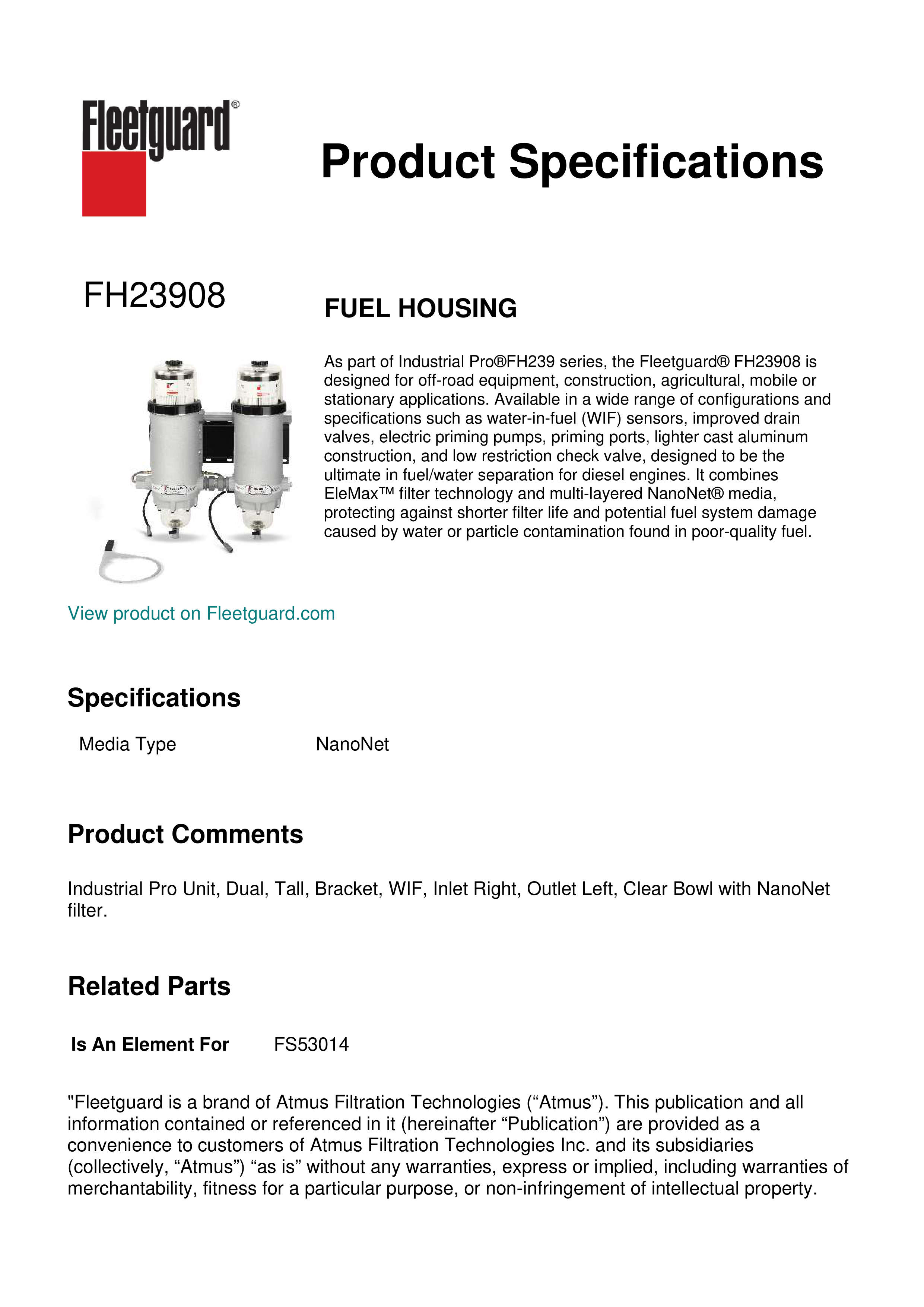 As part of Industrial Pro®FH239 series, the Fleetguard® FH23908 is designed for off-road equipment, construction, agricultural, mobile or stationary applications. Available in a wide range of configurations and specifications such as water-in-fuel (WIF) sensors, improved drain valves, electric priming pumps, priming ports, lighter cast aluminum construction, and low restriction check valve, designed to be the ultimate in fuel/water separation for diesel engines. It combines EleMax™ filter technology and multi-layered NanoNet® media, protecting against shorter filter life and potential fuel system damage caused by water or particle contamination found in poor-quality fuel.Specification
