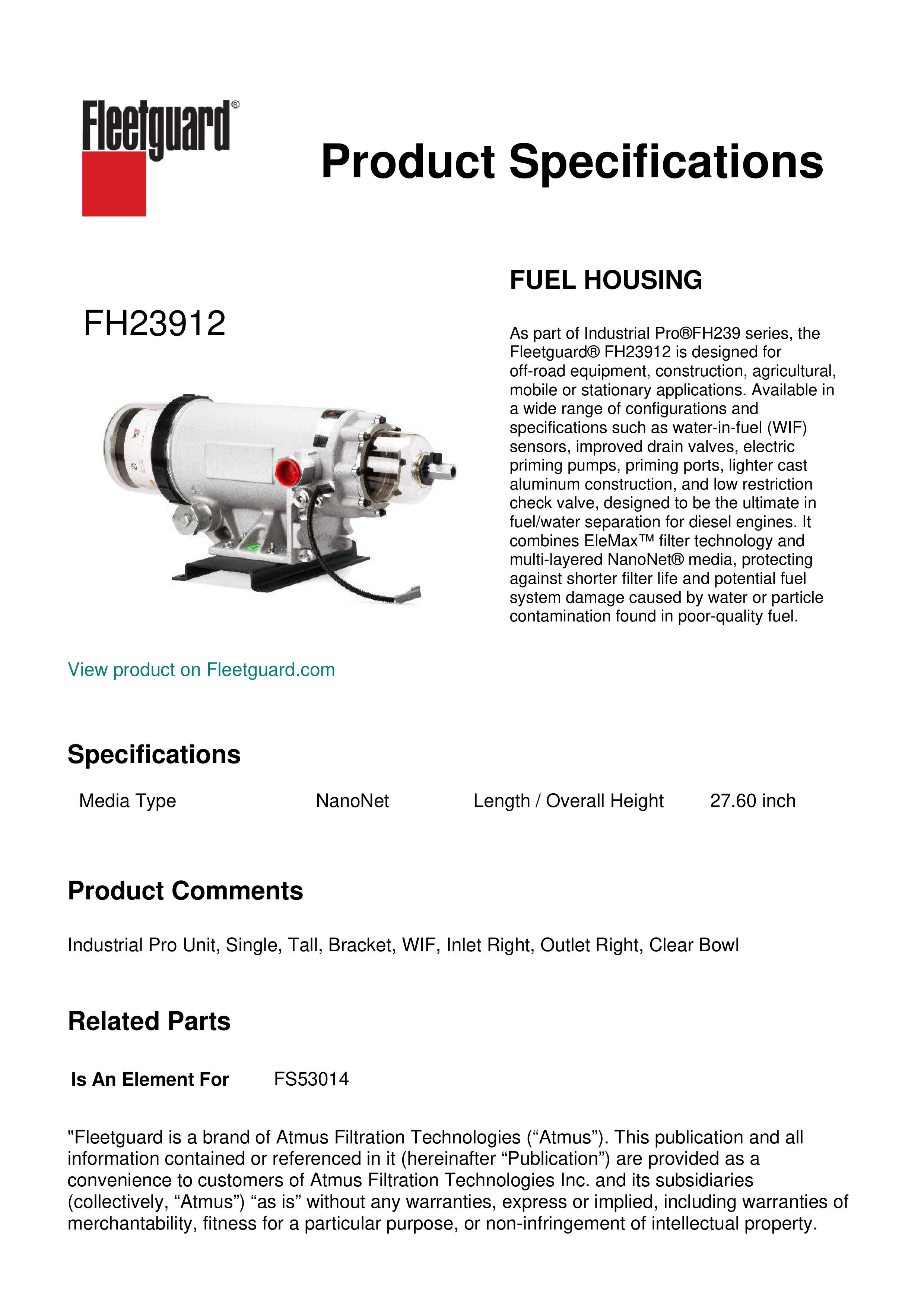 As part of Industrial Pro®FH239 series, the Fleetguard® FH23912 is designed for off-road equipment, construction, agricultural, mobile or stationary applications. Available in a wide range of configurations and specifications such as water-in-fuel (WIF) sensors, improved drain valves, electric priming pumps, priming ports, lighter cast aluminum construction, and low restriction check valve, designed to be the ultimate in fuel/water separation for diesel engines. It combines EleMax™ filter technology and multi-layered NanoNet® media, protecting against shorter filter life and potential fuel system damage caused by water or particle contamination found in poor-quality fuel.Specification