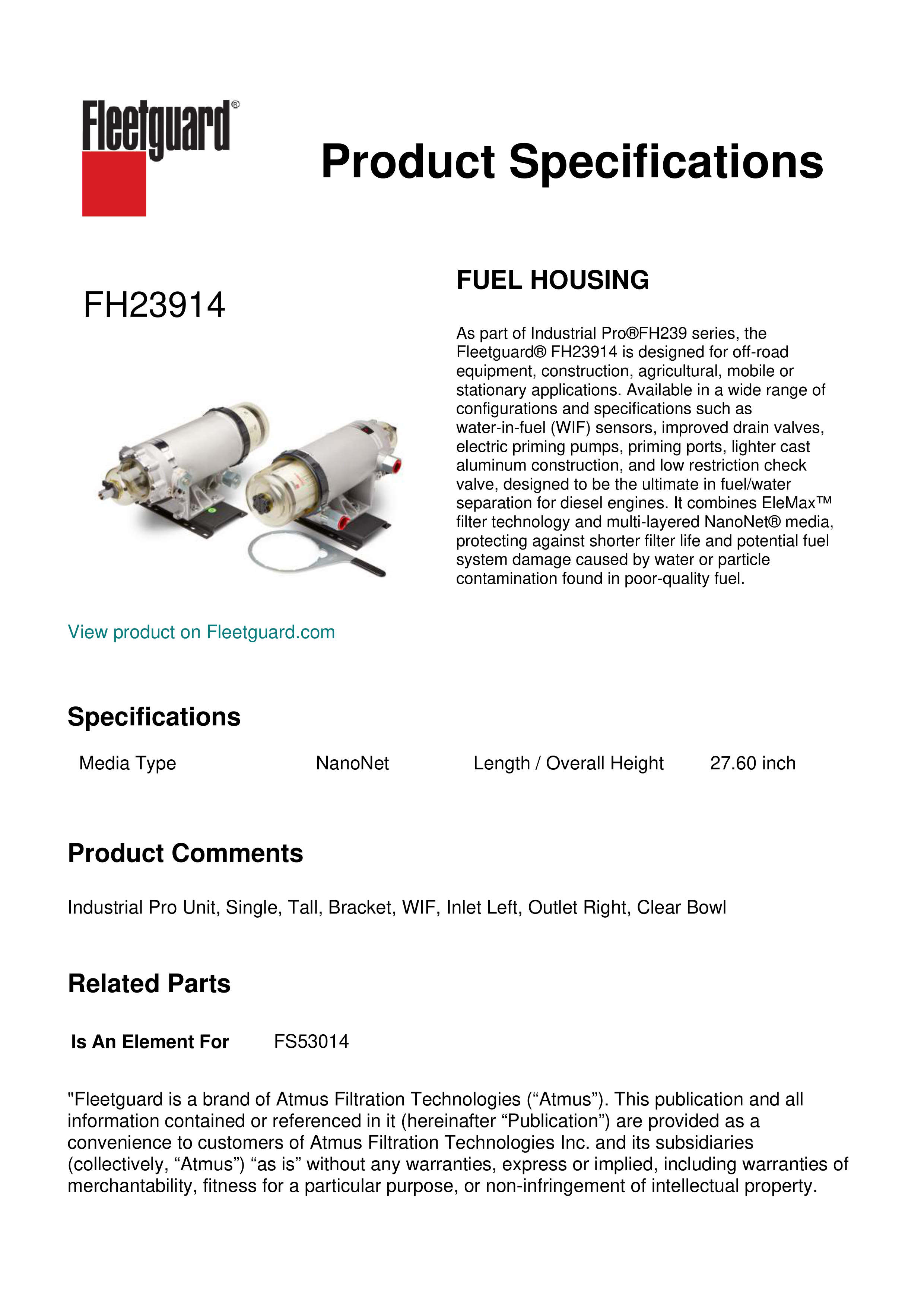 As part of Industrial Pro®FH239 series, the Fleetguard® FH23914 is designed for off-road equipment, construction, agricultural, mobile or stationary applications. Available in a wide range of configurations and specifications such as water-in-fuel (WIF) sensors, improved drain valves, electric priming pumps, priming ports, lighter cast aluminum construction, and low restriction check valve, designed to be the ultimate in fuel/water separation for diesel engines. It combines EleMax™ filter technology and multi-layered NanoNet® media, protecting against shorter filter life and potential fuel system damage caused by water or particle contamination found in poor-quality fuel.Specification