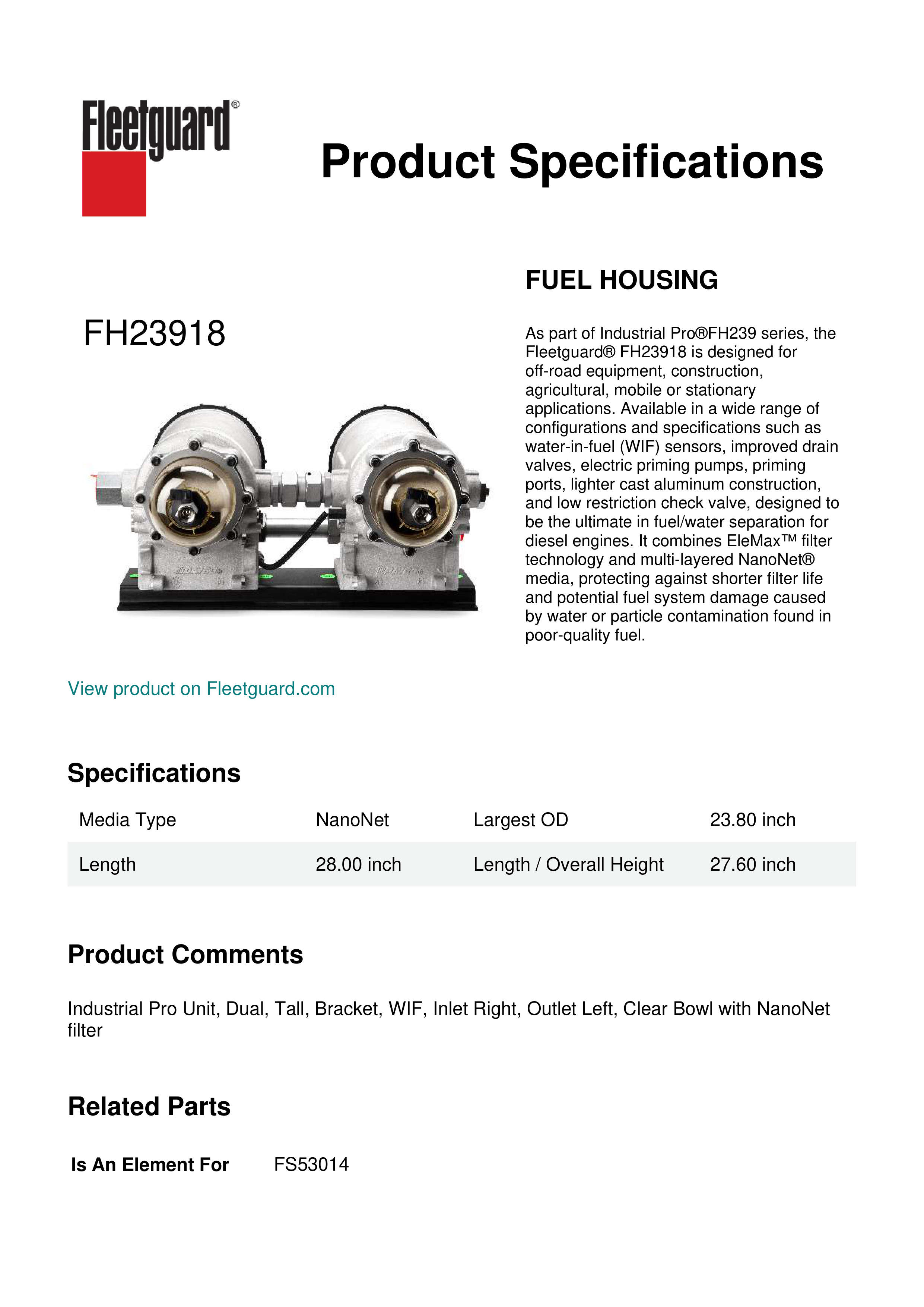 As part of Industrial Pro®FH239 series, the Fleetguard® FH23918 is designed for off-road equipment, construction, agricultural, mobile or stationary applications. Available in a wide range of configurations and specifications such as water-in-fuel (WIF) sensors, improved drain valves, electric priming pumps, priming ports, lighter cast aluminum construction, and low restriction check valve, designed to be the ultimate in fuel/water separation for diesel engines. It combines EleMax™ filter technology and multi-layered NanoNet® media, protecting against shorter filter life and potential fuel system damage caused by water or particle contamination found in poor-quality fuel.Specification