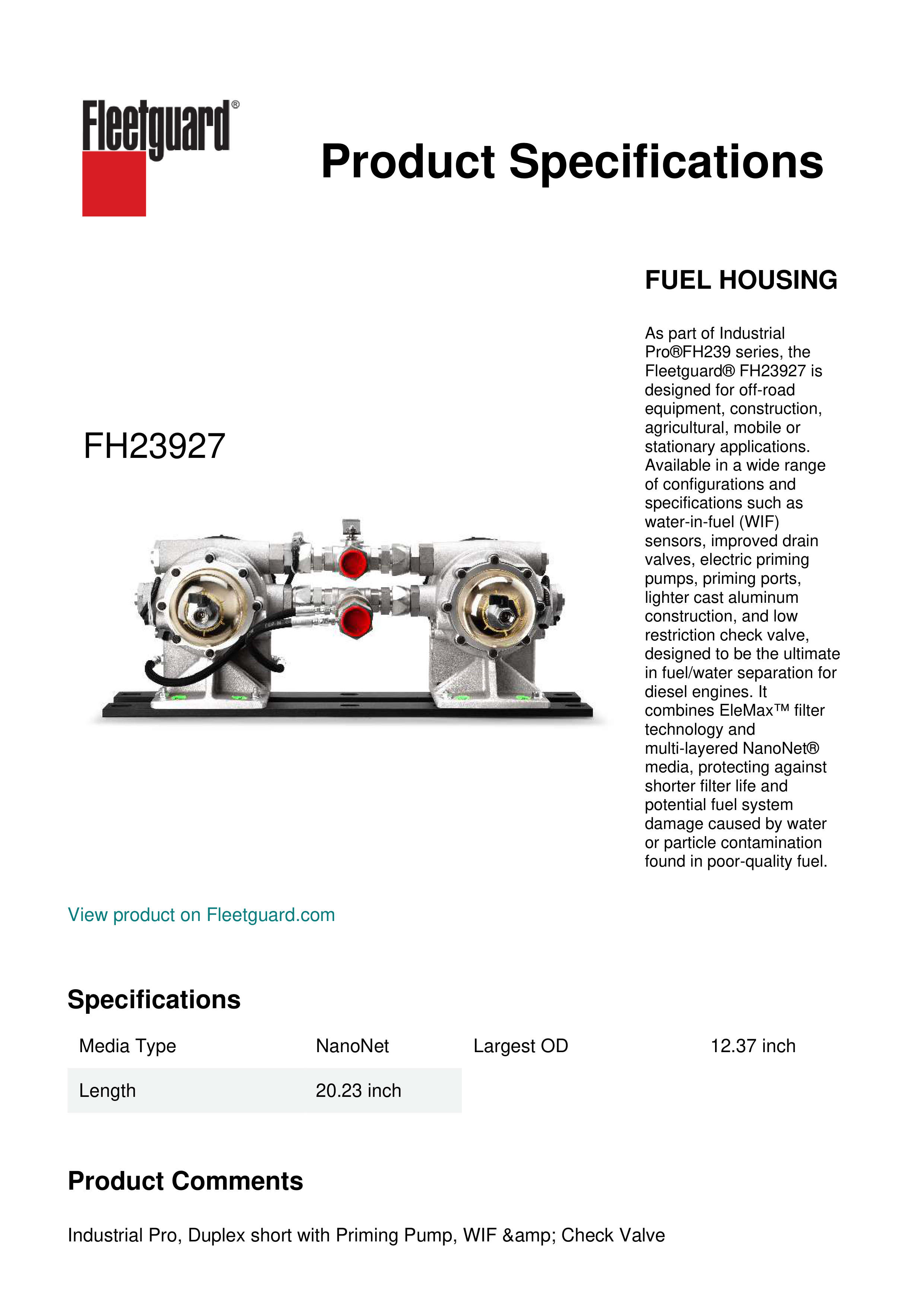 As part of Industrial Pro®FH239 series, the Fleetguard® FH23927 is designed for off-road equipment, construction, agricultural, mobile or stationary applications. Available in a wide range of configurations and specifications such as water-in-fuel (WIF) sensors, improved drain valves, electric priming pumps, priming ports, lighter cast aluminum construction, and low restriction check valve, designed to be the ultimate in fuel/water separation for diesel engines. It combines EleMax™ filter technology and multi-layered NanoNet® media, protecting against shorter filter life and potential fuel system damage caused by water or particle contamination found in poor-quality fuel.Specification