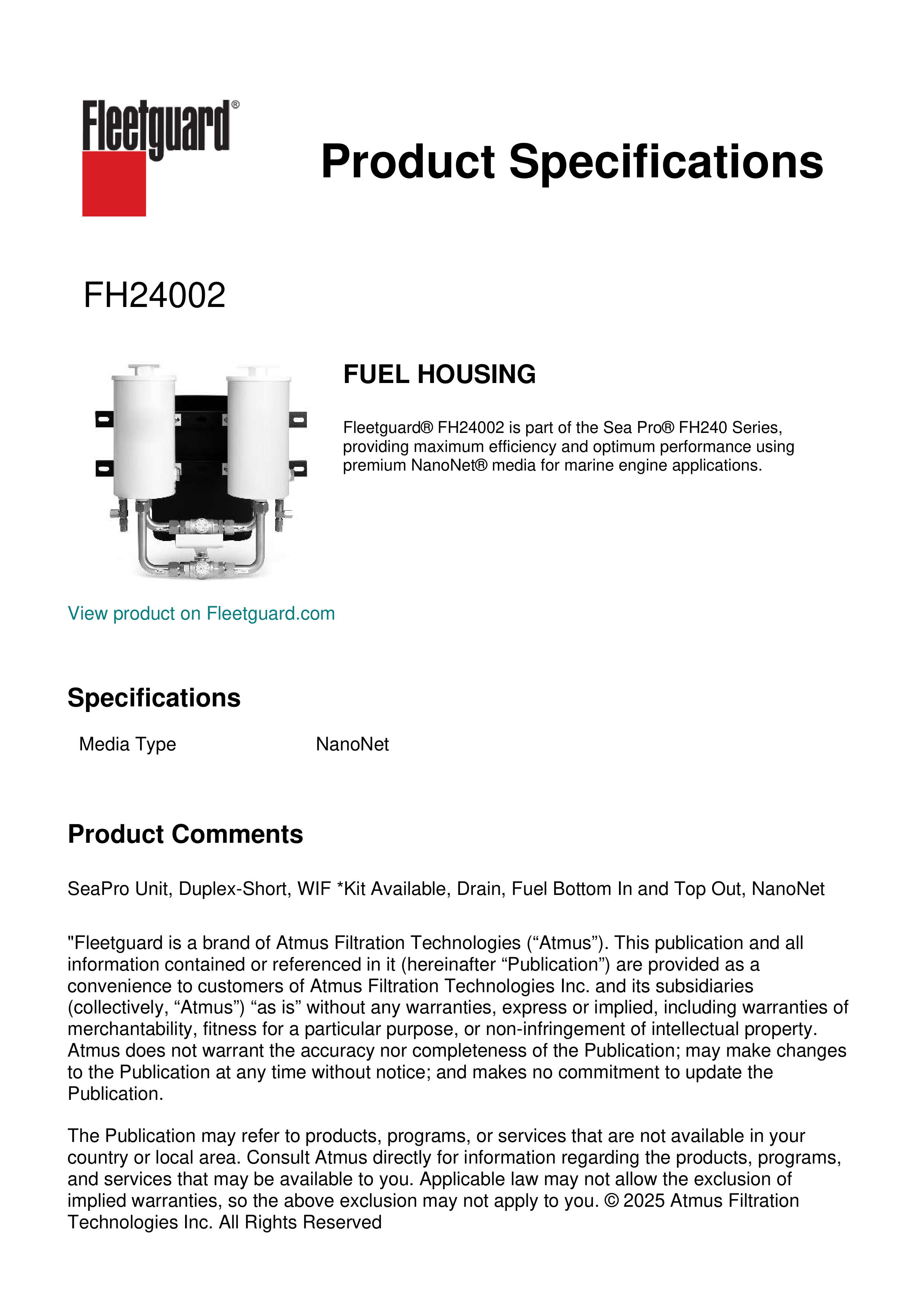 Fleetguard® FH24002 is part of the Sea Pro® FH240 Series, providing maximum efficiency and optimum performance using premium NanoNet® media for marine engine applications.