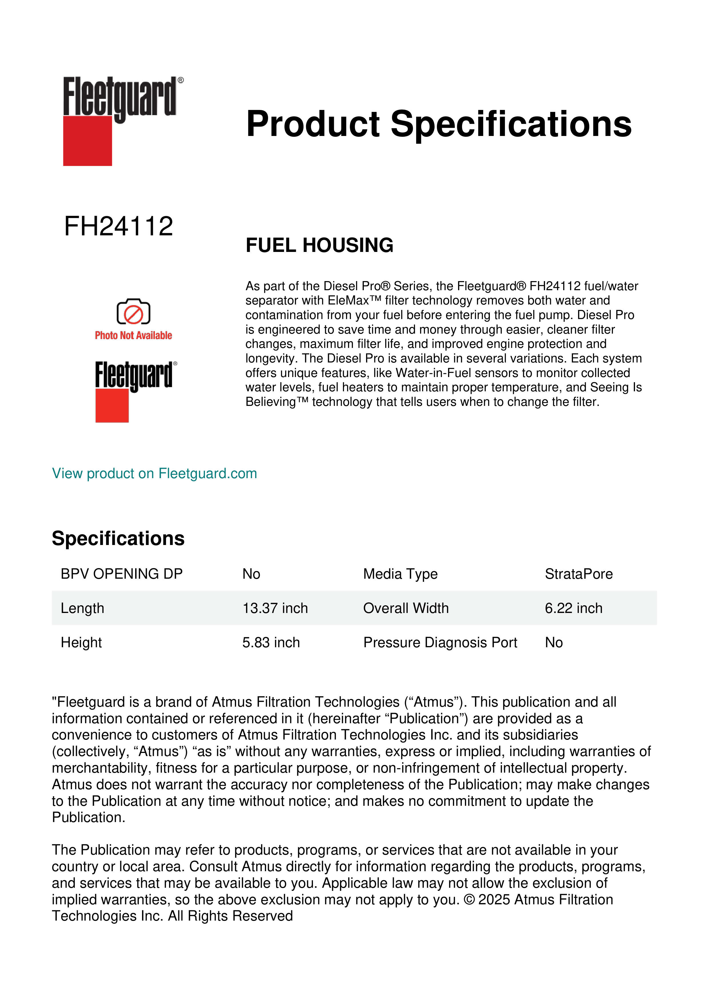 As part of the Diesel Pro® Series, the Fleetguard® FH24112 fuel/water separator with EleMax™ filter technology removes both water and contamination from your fuel before entering the fuel pump. Diesel Pro is engineered to save time and money through easier, cleaner filter changes, maximum filter life, and improved engine protection and longevity. The Diesel Pro is available in several variations. Each system offers unique features, like Water-in-Fuel sensors to monitor collected water levels, fuel heaters to maintain proper temperature, and Seeing Is Believing™ technology that tells users when to change the filter.Specification