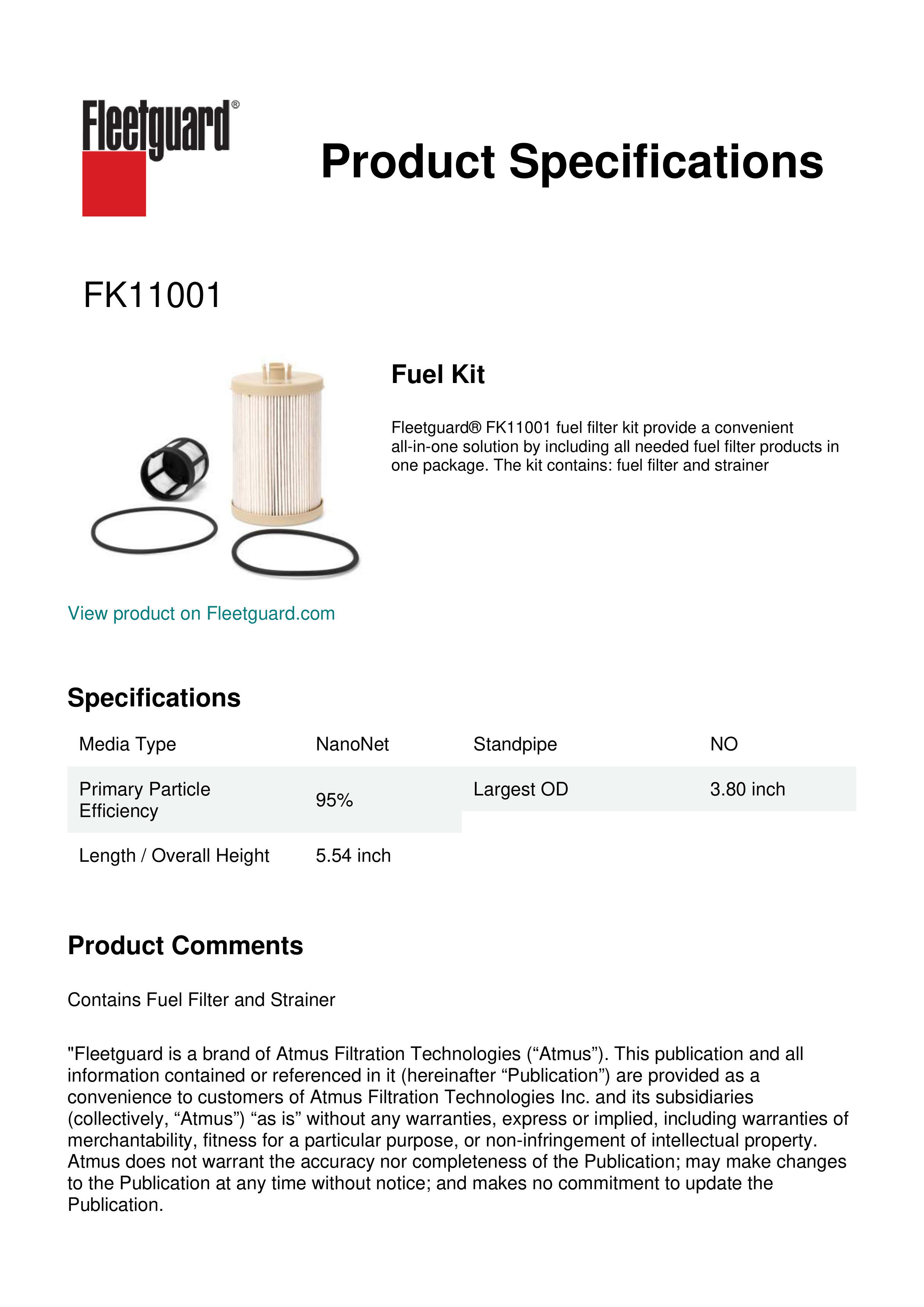 Fleetguard® FK11001 fuel filter kit provide a convenient all-in-one solution by including all needed fuel filter products in one package. The kit contains: fuel filter and strainerSpecification