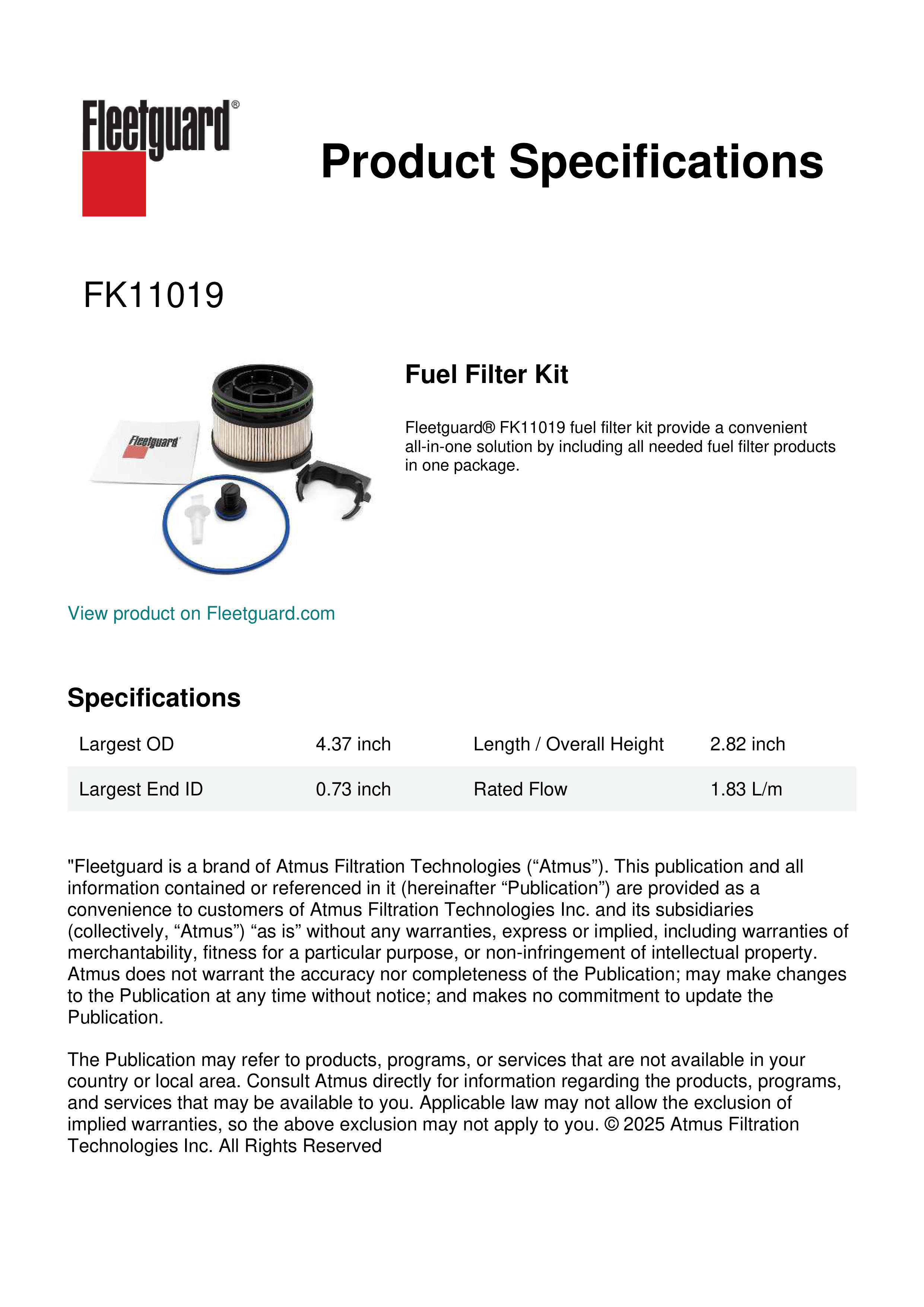 Fleetguard® FK11019 fuel filter kit provide a convenient all-in-one solution by including all needed fuel filter products in one package.Specification