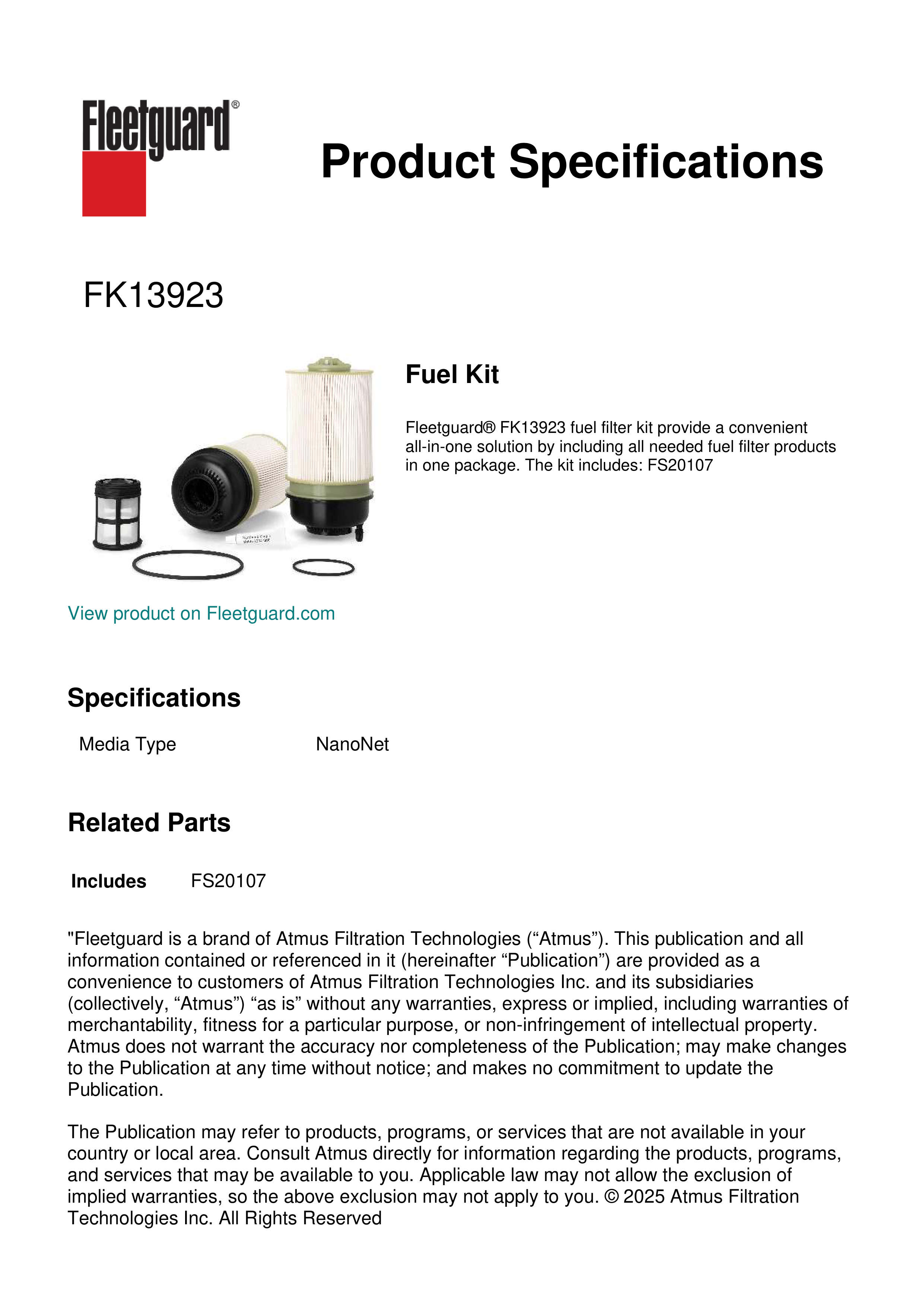 Fleetguard® FK13923 fuel filter kit provide a convenient all-in-one solution by including all needed fuel filter products in one package. The kit includes: FS20107Specification