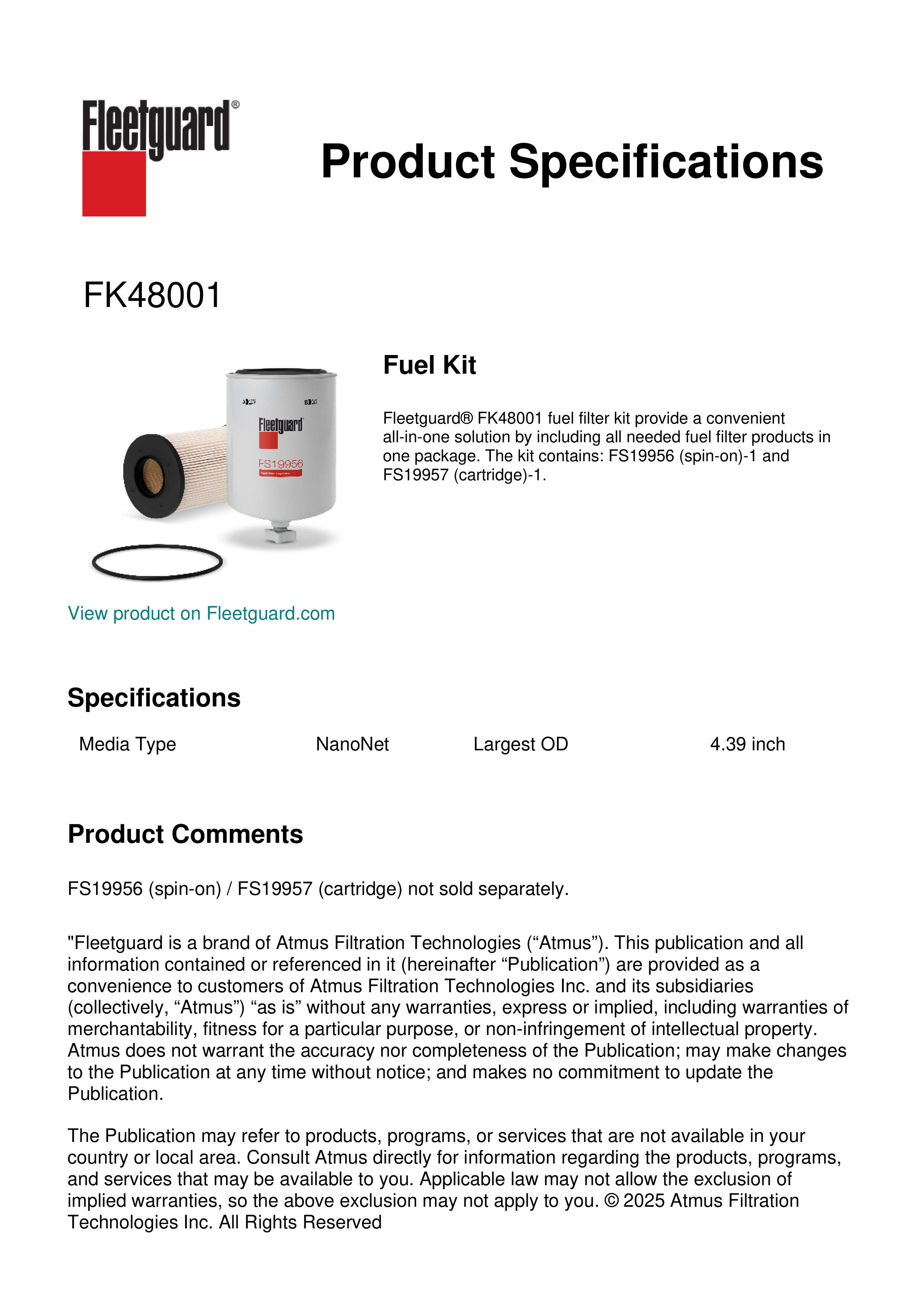 Fleetguard® FK48001 fuel filter kit provide a convenient all-in-one solution by including all needed fuel filter products in one package. The kit contains: FS19956 (spin-on)-1 and FS19957 (cartridge)-1.Specification
