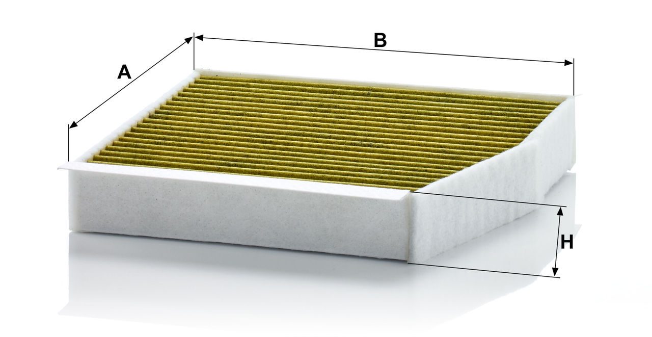 Biofunctional MANN-FILTER FreciousPlus cabin air filters - nearly 100% protection against nitrogen oxides, dust, allergens and mould - harmful gases and unpleasant odours are also eliminated and virus aerosols filtered. The three-layer filter technology absorbs almost 100% of allergens, reduces the growth of molds and bacteria by more than 98% and stops fine dust almost completely.Specification