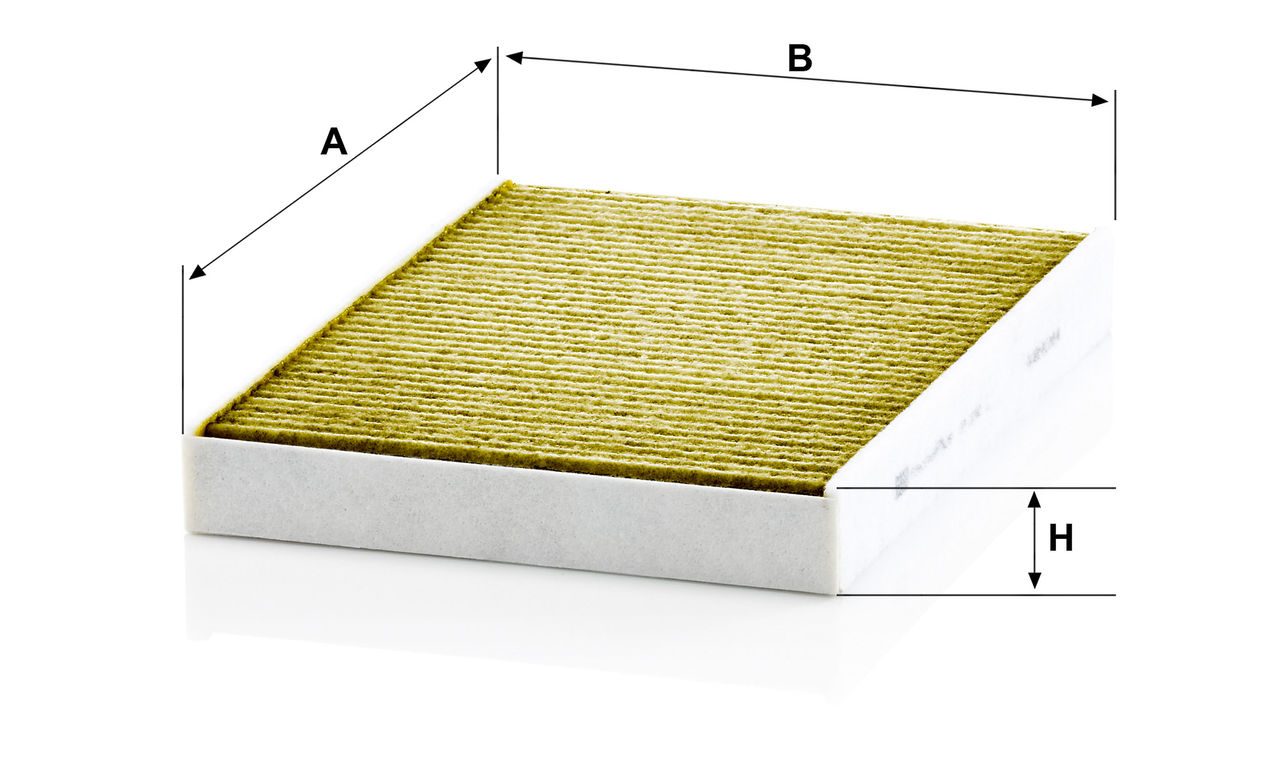 Biofunctional MANN-FILTER FreciousPlus cabin air filters - nearly 100% protection against nitrogen oxides, dust, allergens and mould - harmful gases and unpleasant odours are also eliminated and virus aerosols filtered. The three-layer filter technology absorbs almost 100% of allergens, reduces the growth of molds and bacteria by more than 98% and stops fine dust almost completely.Specification