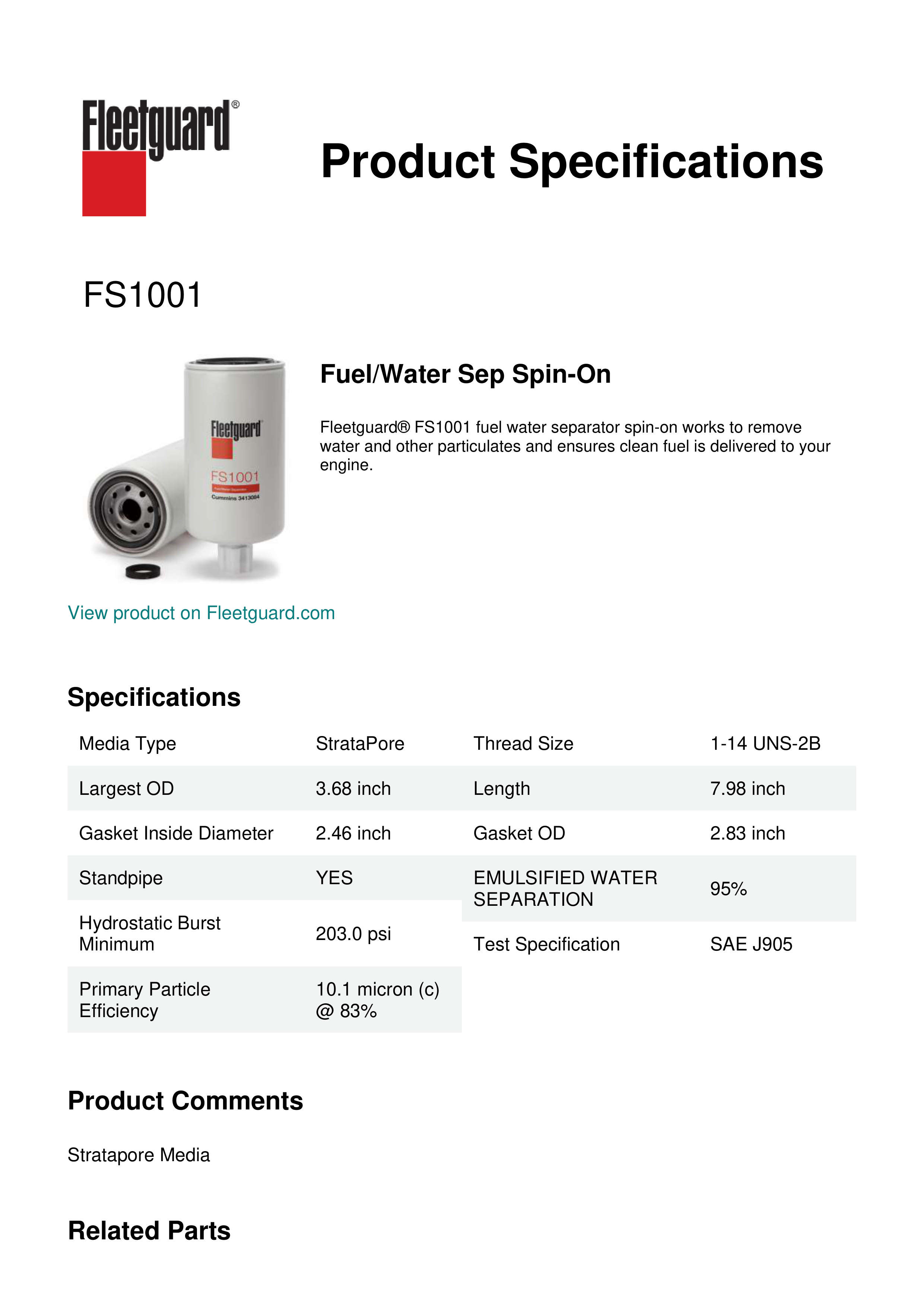 Fleetguard® FS1001 fuel water separator spin-on works to remove water and other particulates and ensures clean fuel is delivered to your engine.Specification