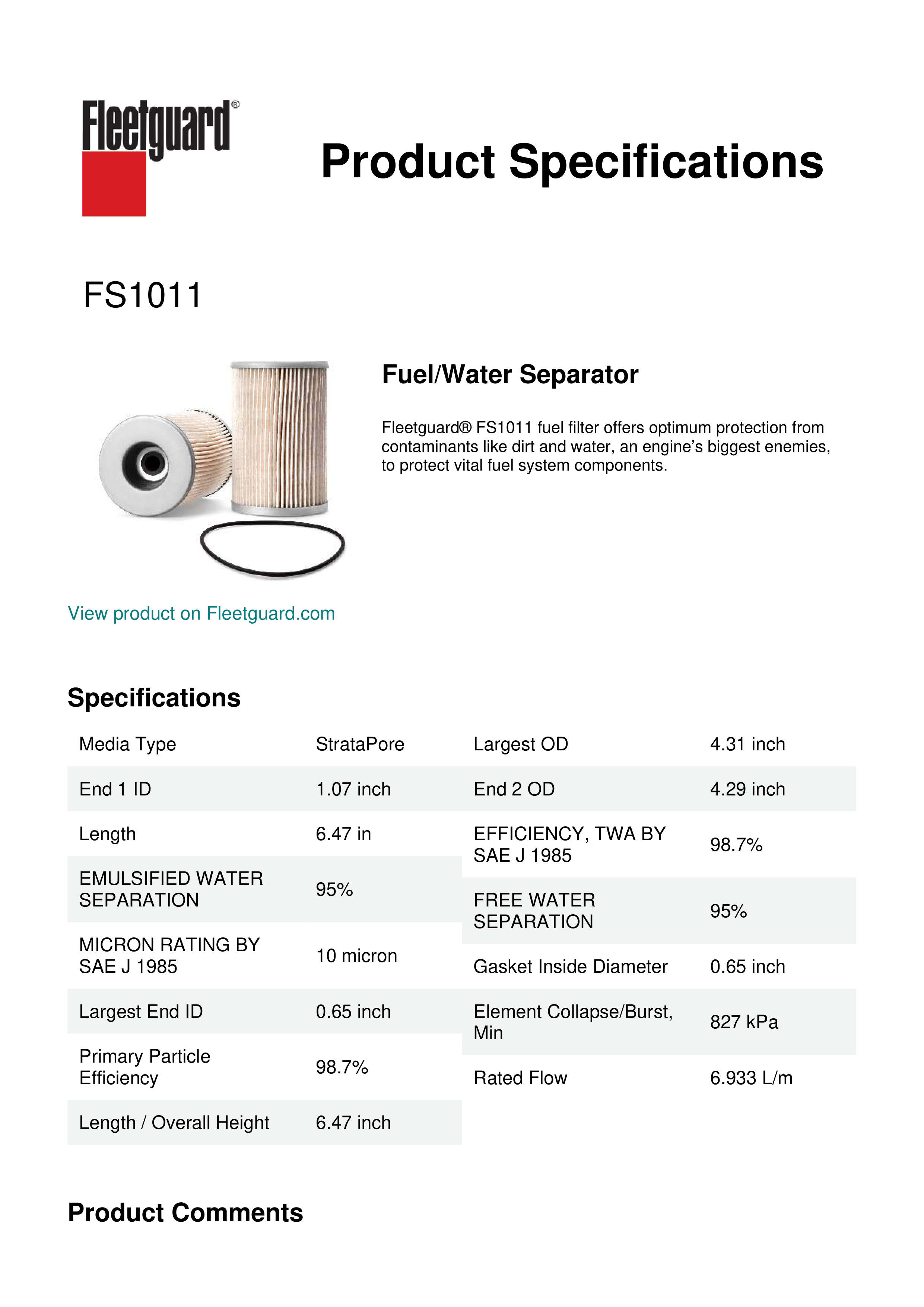 Fleetguard® FS1011 fuel filter offers optimum protection from contaminants like dirt and water, an engine’s biggest enemies, to protect vital fuel system components.Specification