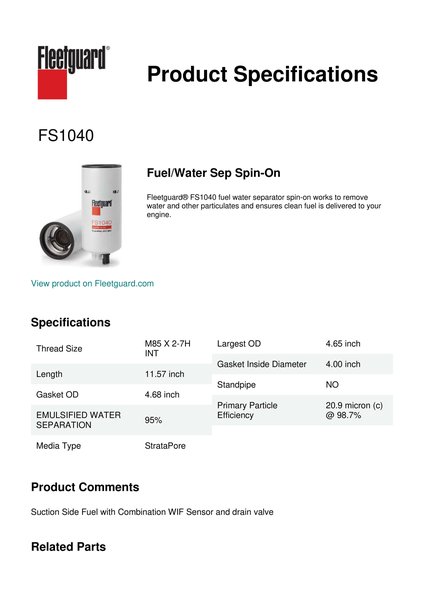 Fleetguard® FS1040 fuel water separator spin-on works to remove water and other particulates and ensures clean fuel is delivered to your engine.Specification