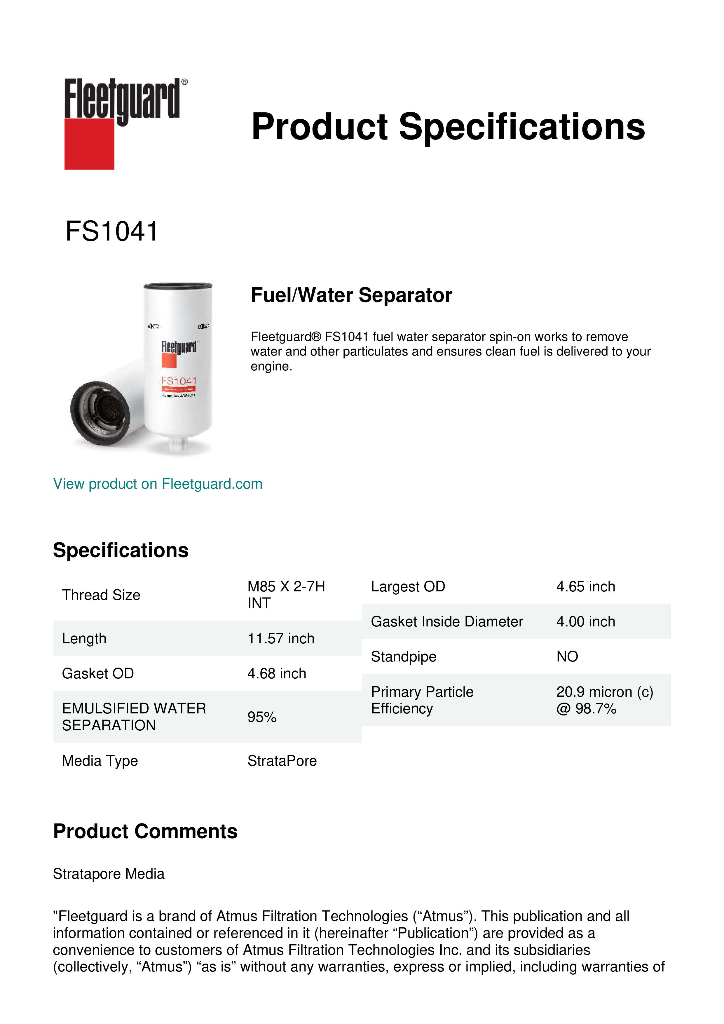 Fleetguard® FS1041 fuel water separator spin-on works to remove water and other particulates and ensures clean fuel is delivered to your engine.Specification