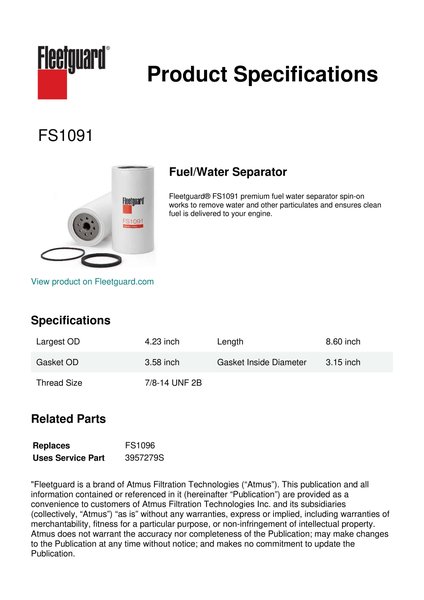 Fleetguard® FS1091 premium fuel water separator spin-on works to remove water and other particulates and ensures clean fuel is delivered to your engine.Specification
