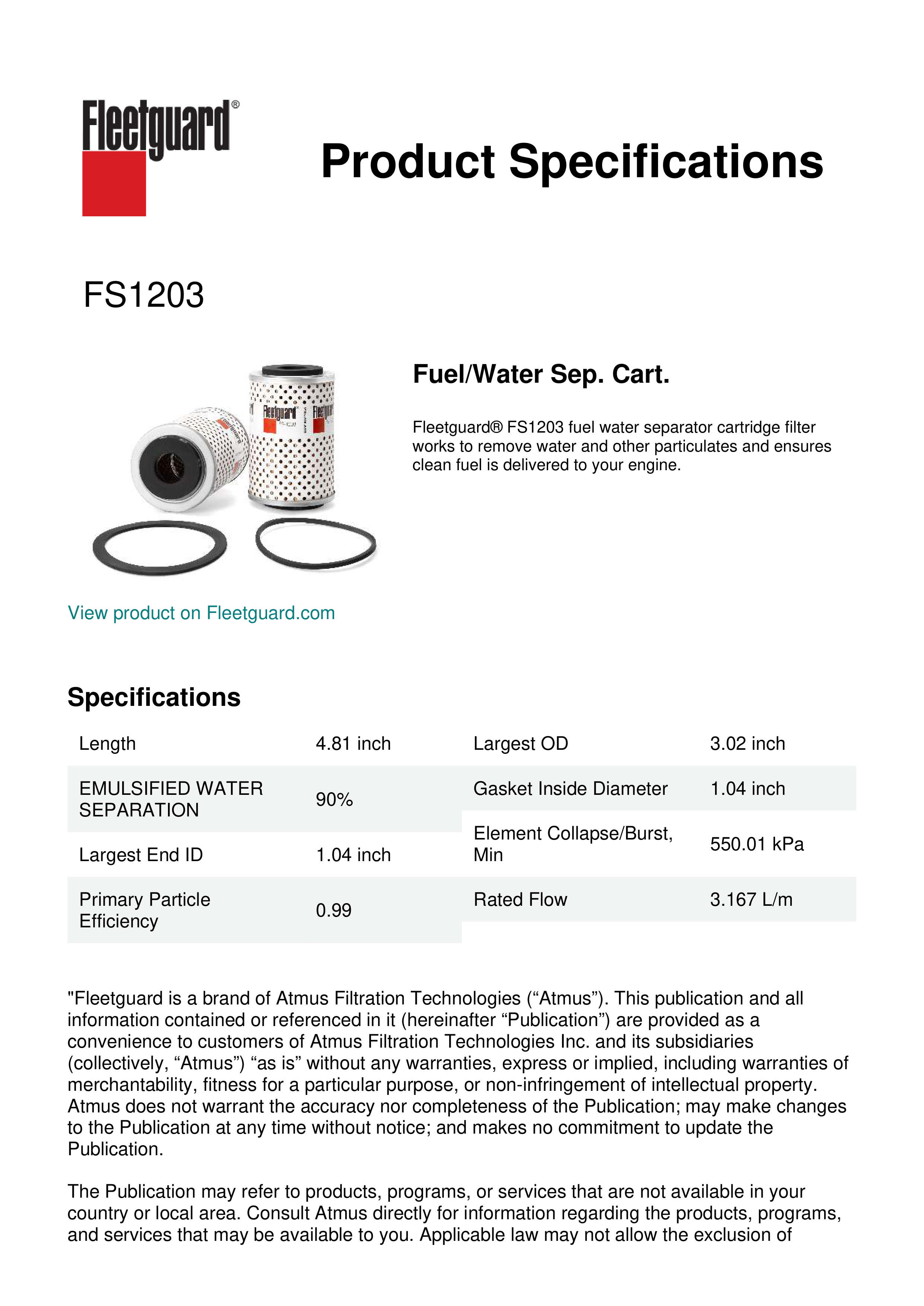 Fleetguard® FS1203 fuel water separator cartridge filter works to remove water and other particulates and ensures clean fuel is delivered to your engine.Specification