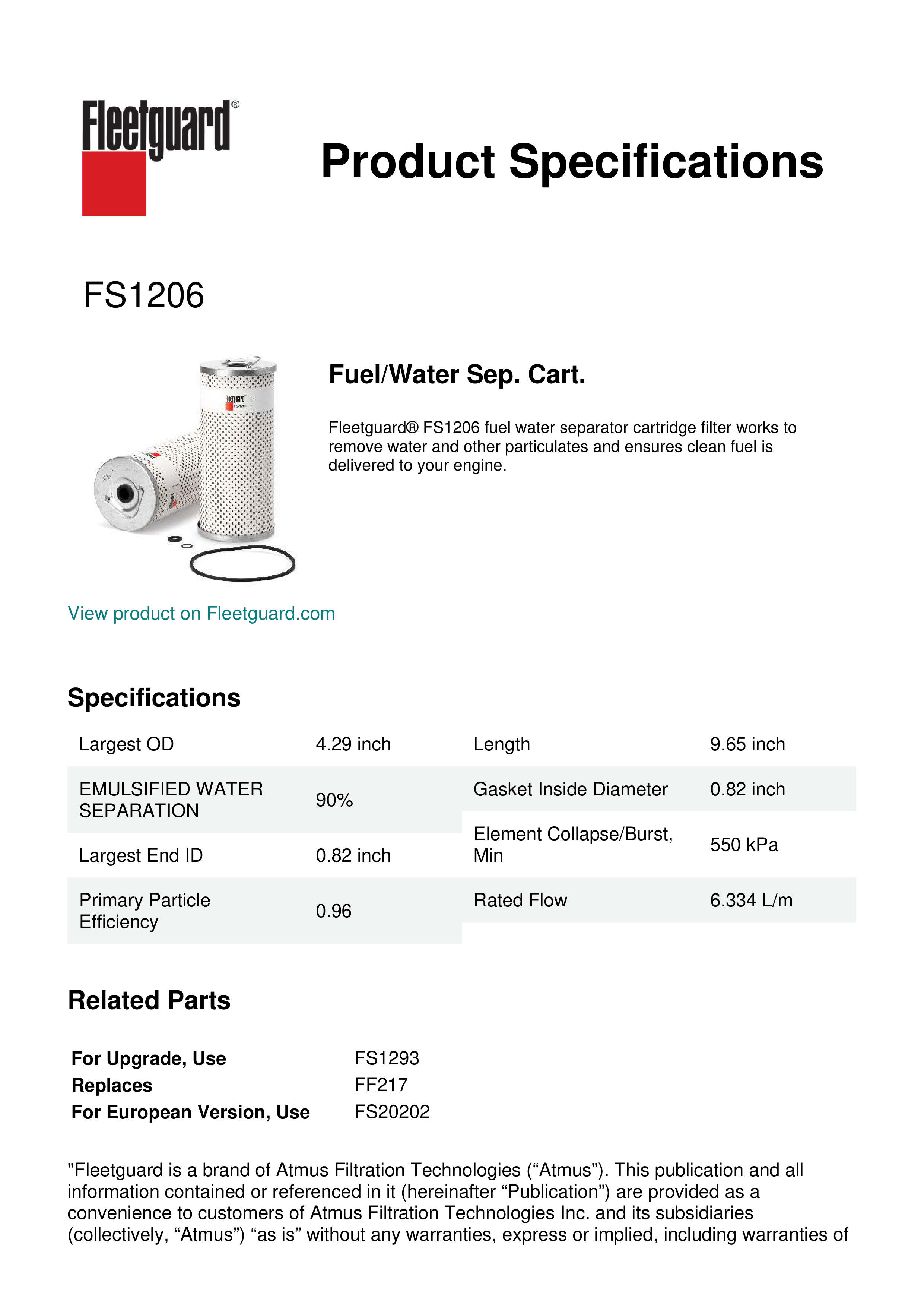 Fleetguard® FS1206 fuel water separator cartridge filter works to remove water and other particulates and ensures clean fuel is delivered to your engine.Specification