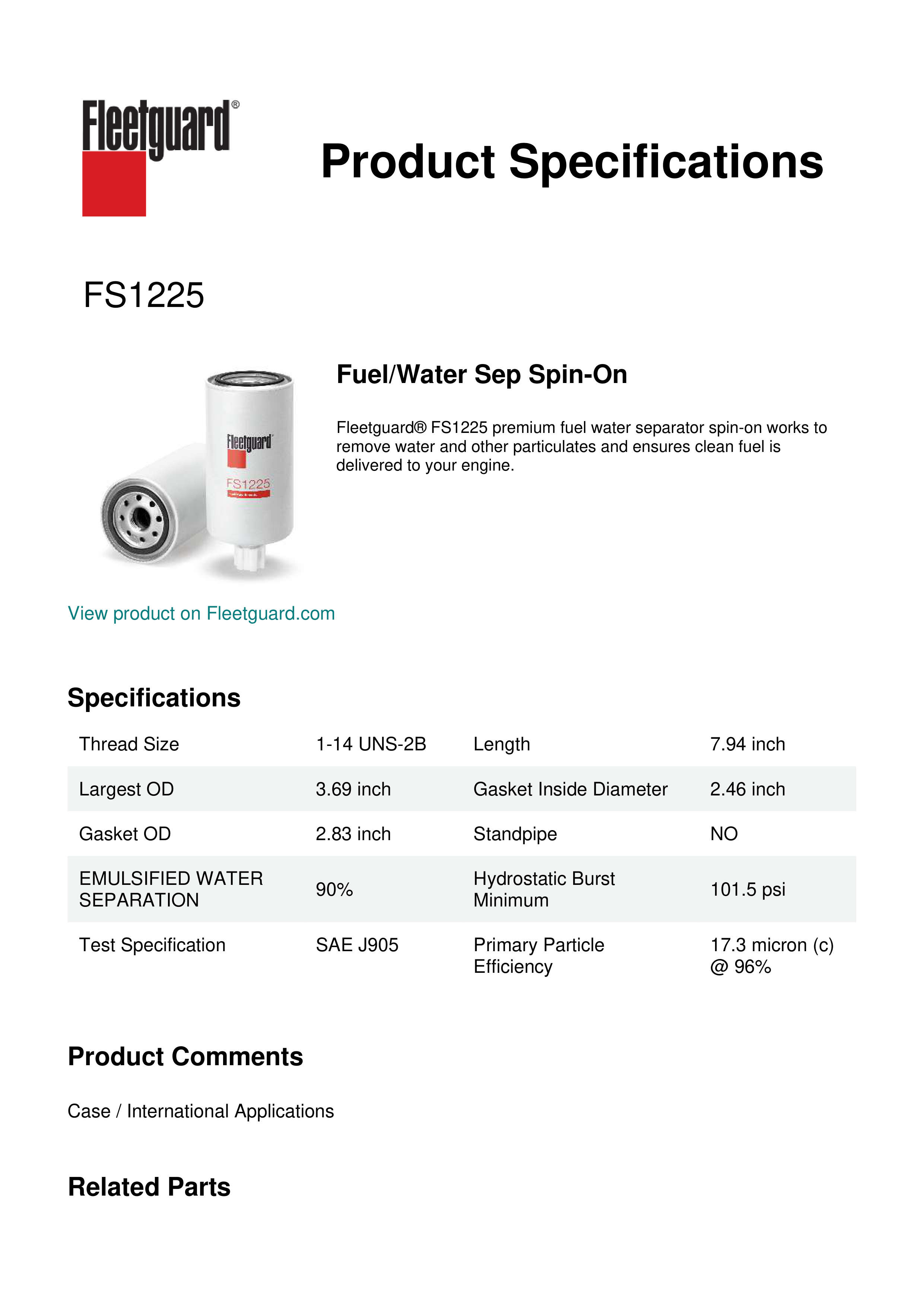 Fleetguard® FS1225 premium fuel water separator spin-on works to remove water and other particulates and ensures clean fuel is delivered to your engine.Specification