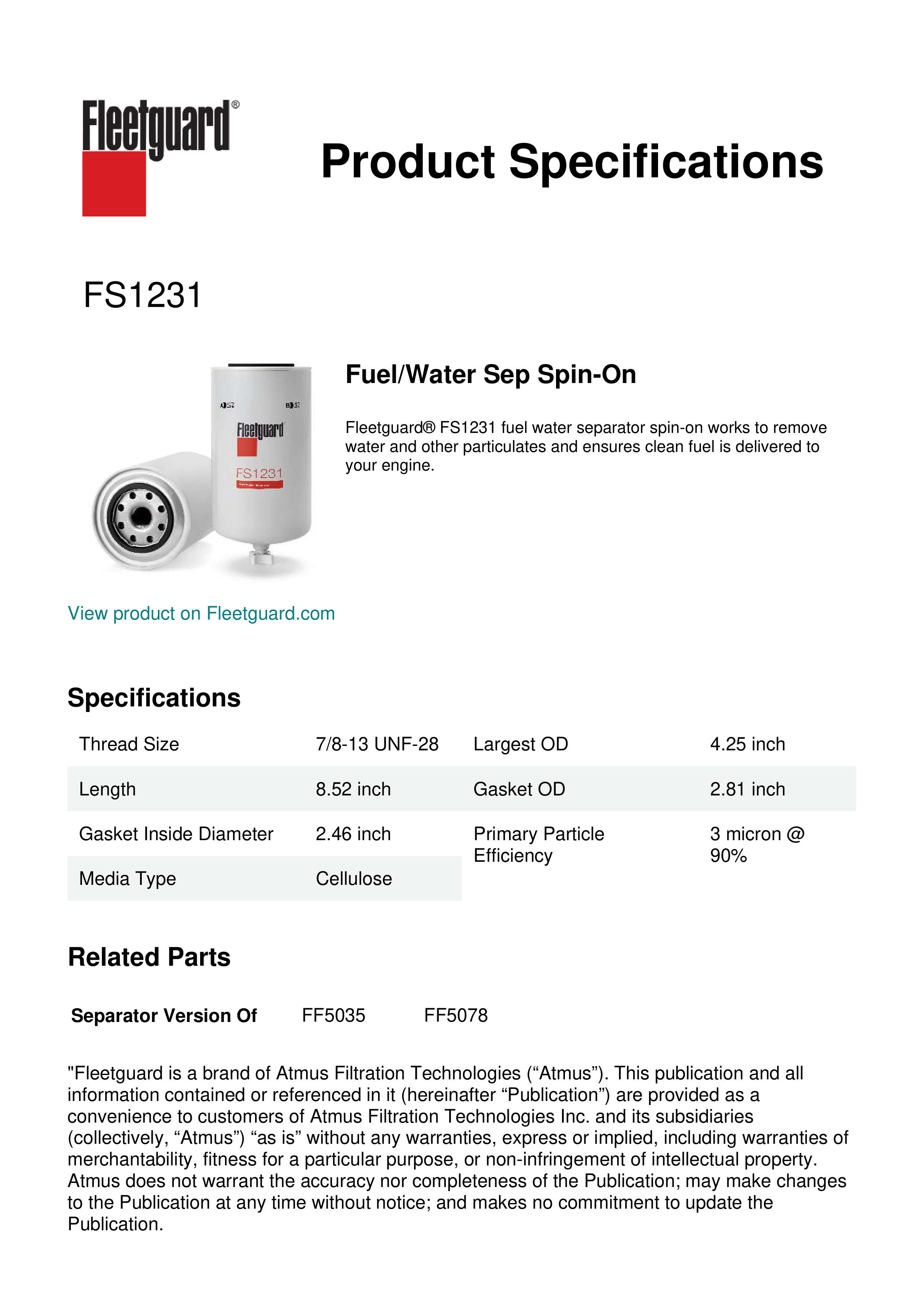 Fleetguard® FS1231 fuel water separator spin-on works to remove water and other particulates and ensures clean fuel is delivered to your engine.Specification