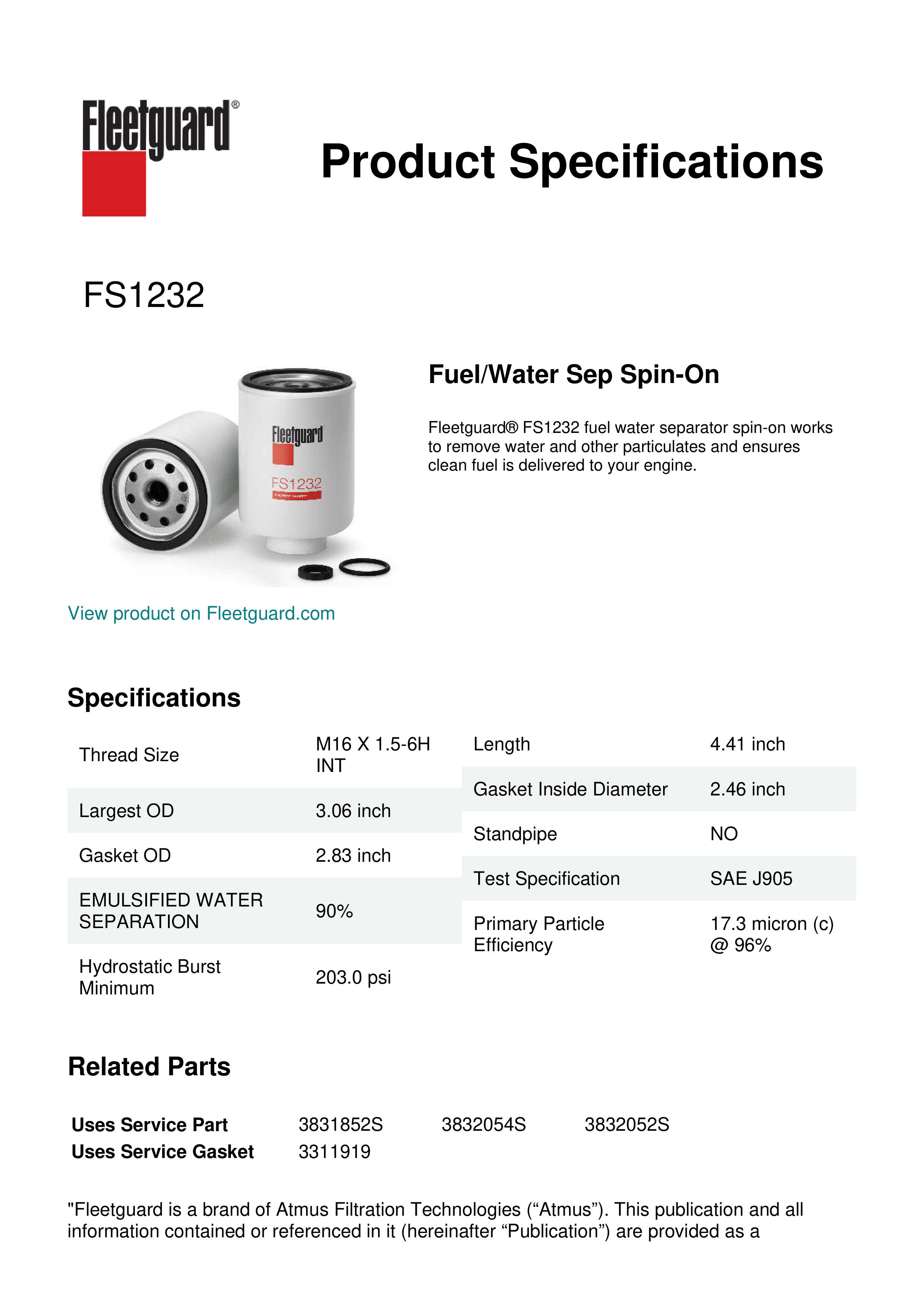 Fleetguard® FS1232 fuel water separator spin-on works to remove water and other particulates and ensures clean fuel is delivered to your engine.Specification
