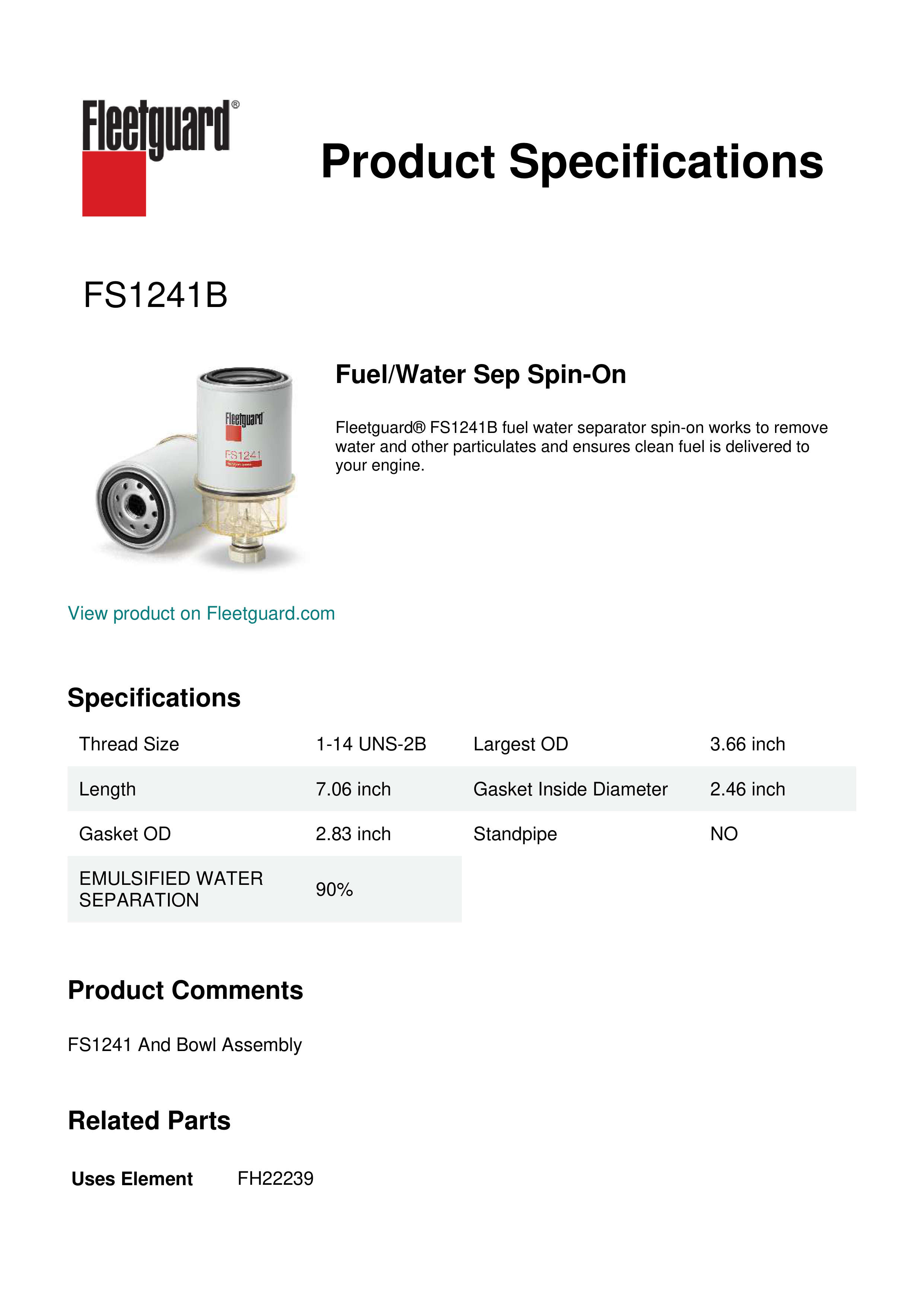Fleetguard® FS1241B fuel water separator spin-on works to remove water and other particulates and ensures clean fuel is delivered to your engine.Specification