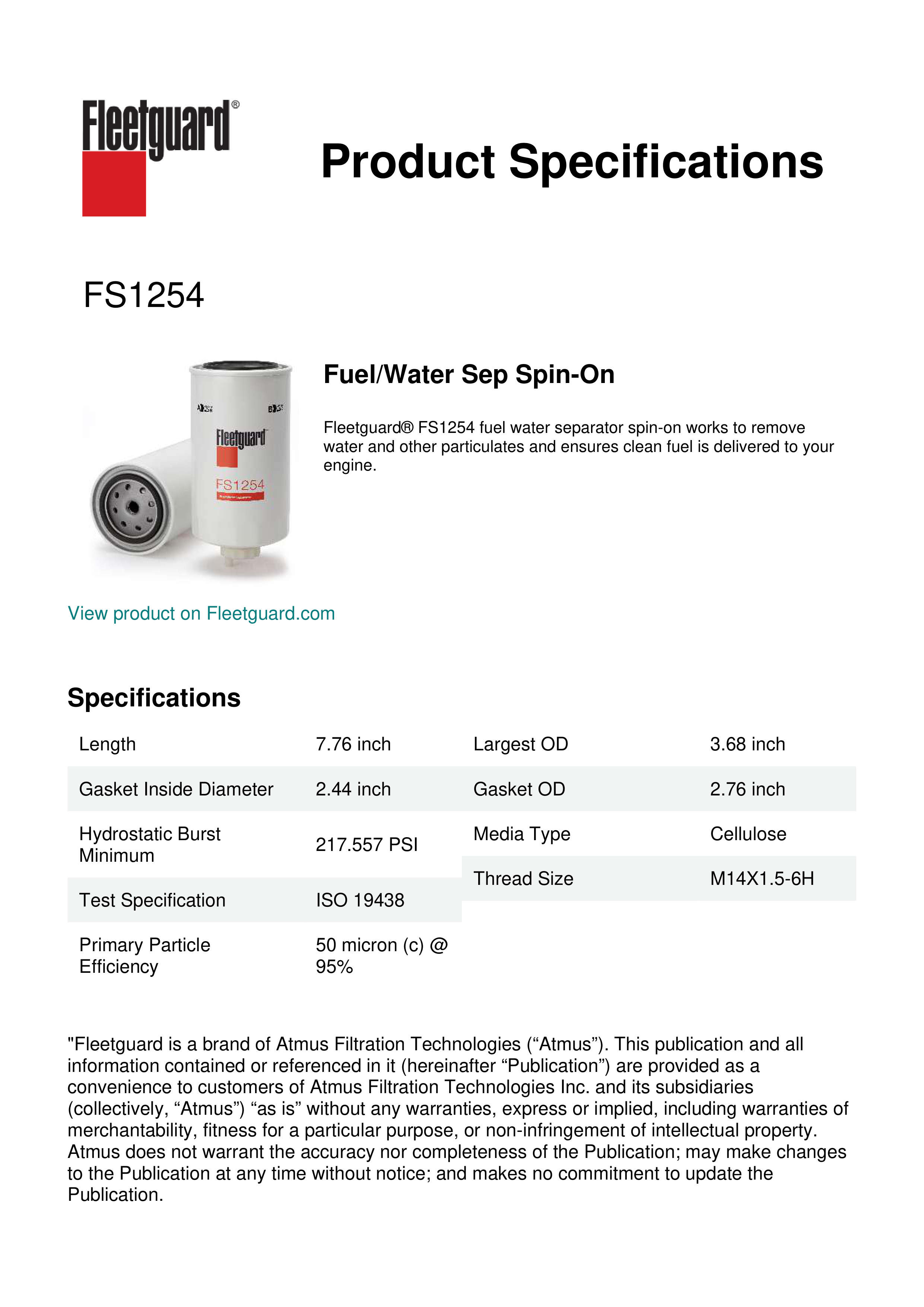 Fleetguard® FS1254 fuel water separator spin-on works to remove water and other particulates and ensures clean fuel is delivered to your engine.Specification