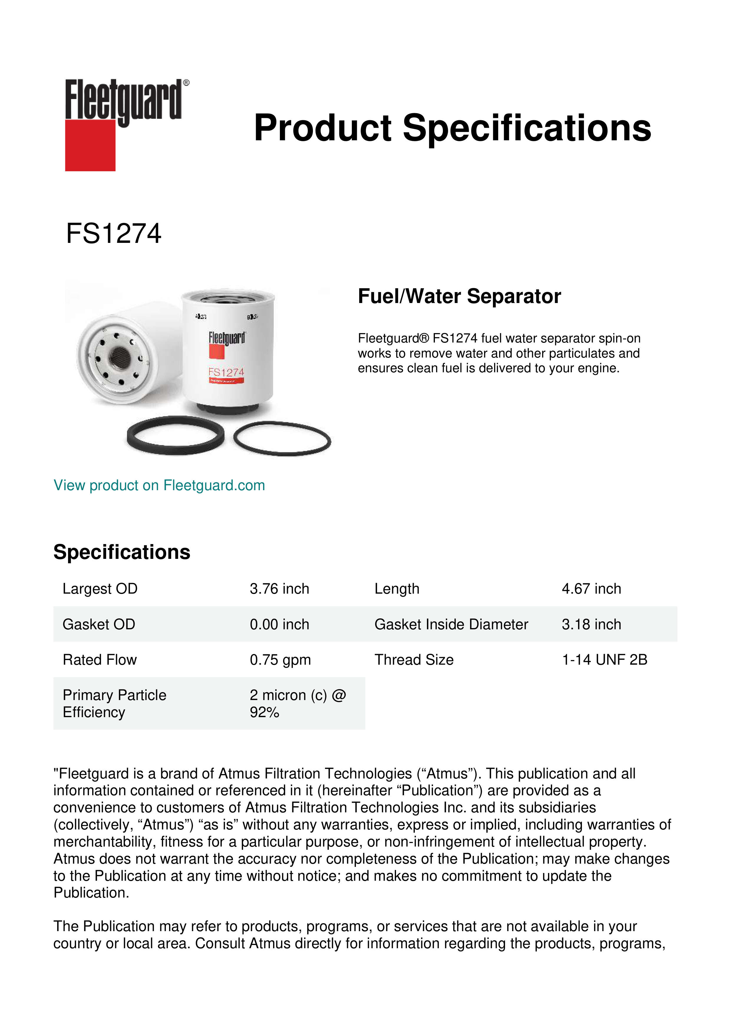 Fleetguard® FS1274 fuel water separator spin-on works to remove water and other particulates and ensures clean fuel is delivered to your engine.Specification