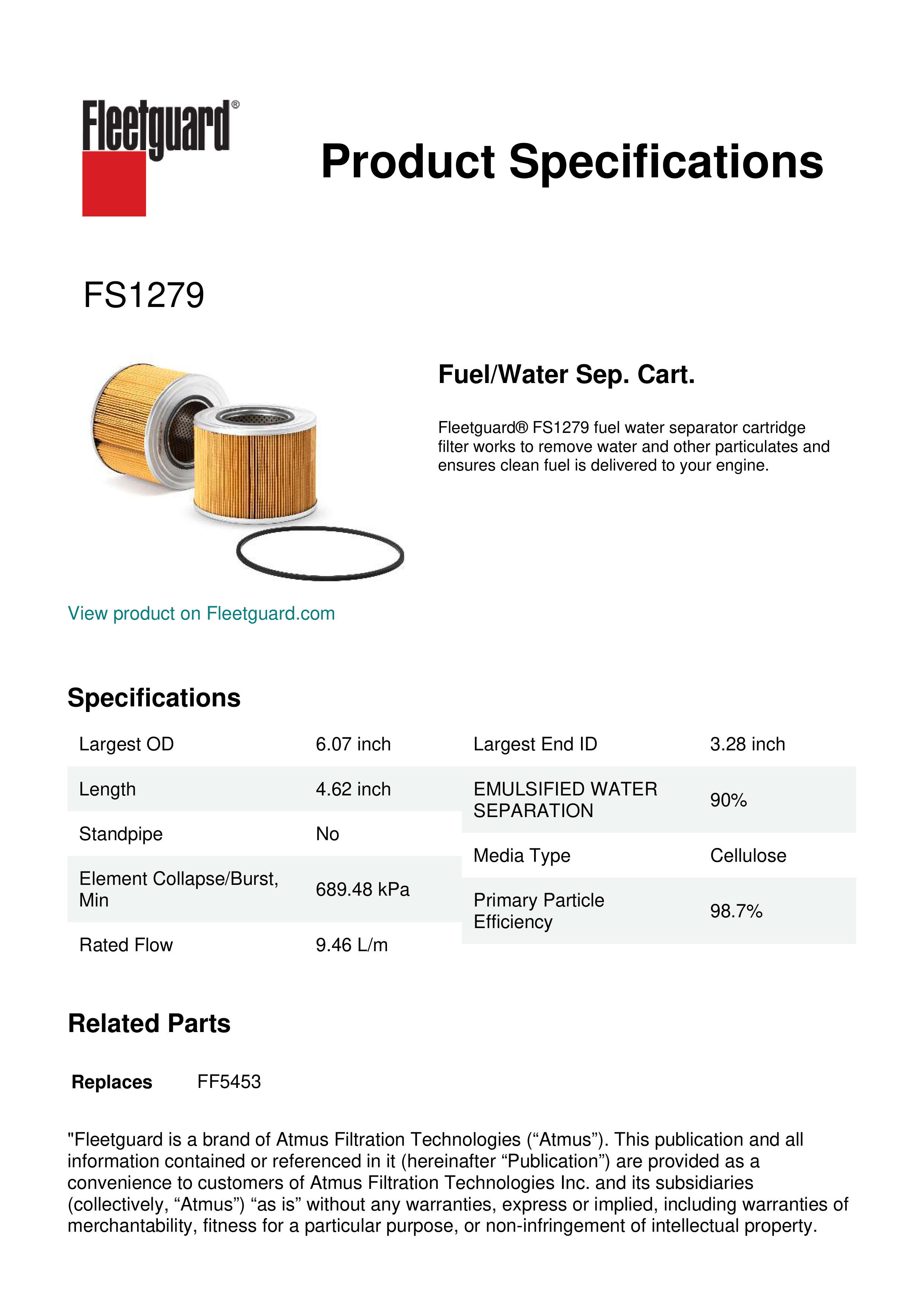Fleetguard® FS1279 fuel water separator cartridge filter works to remove water and other particulates and ensures clean fuel is delivered to your engine.Specification