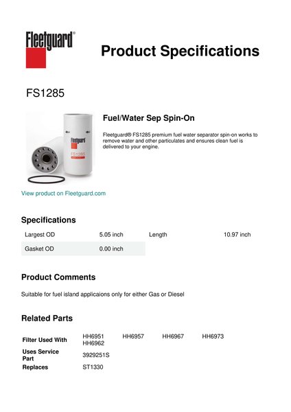 Fleetguard® FS1285 premium fuel water separator spin-on works to remove water and other particulates and ensures clean fuel is delivered to your engine.Specification