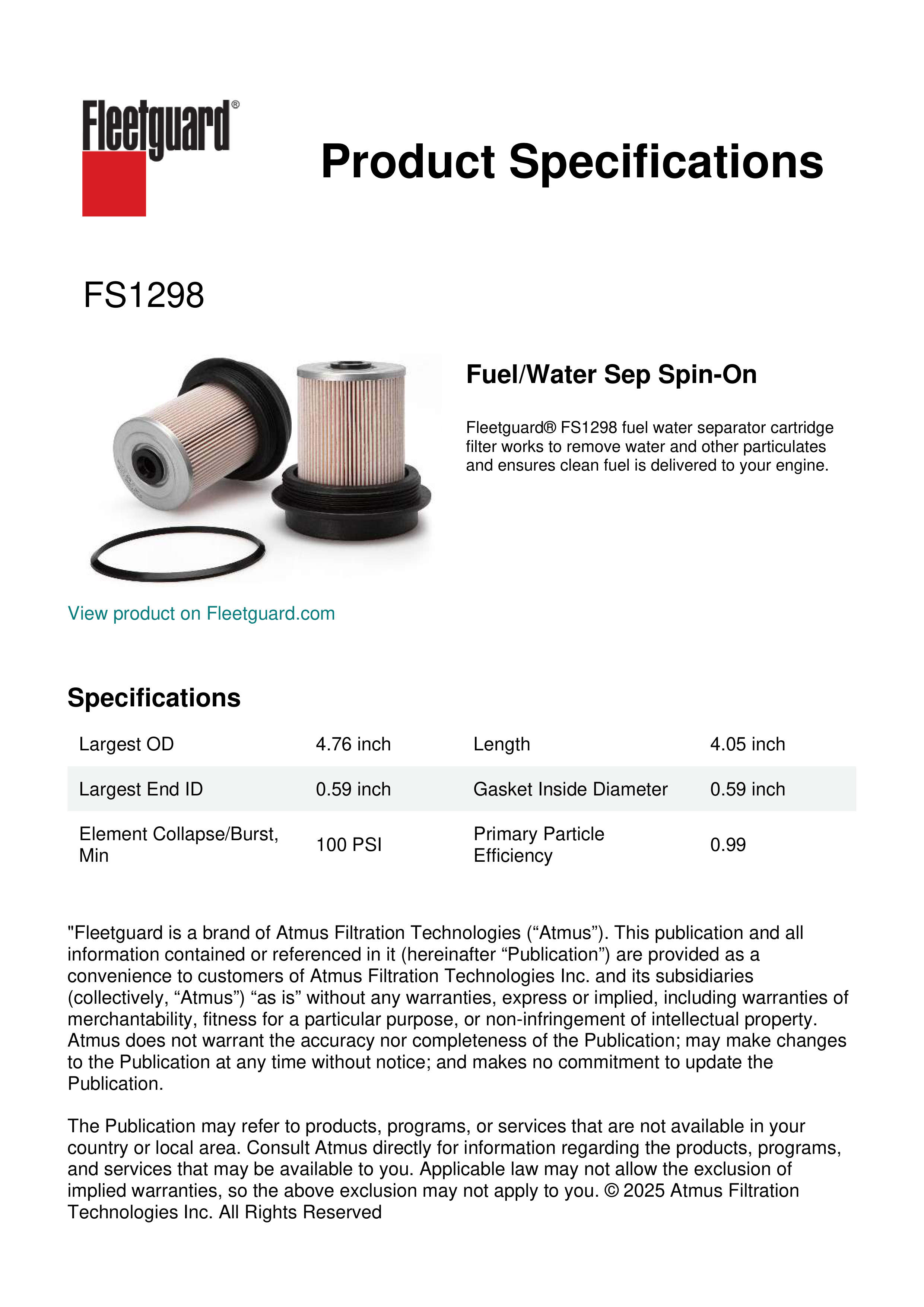 Fleetguard® FS1298 fuel water separator cartridge filter works to remove water and other particulates and ensures clean fuel is delivered to your engine.Specification