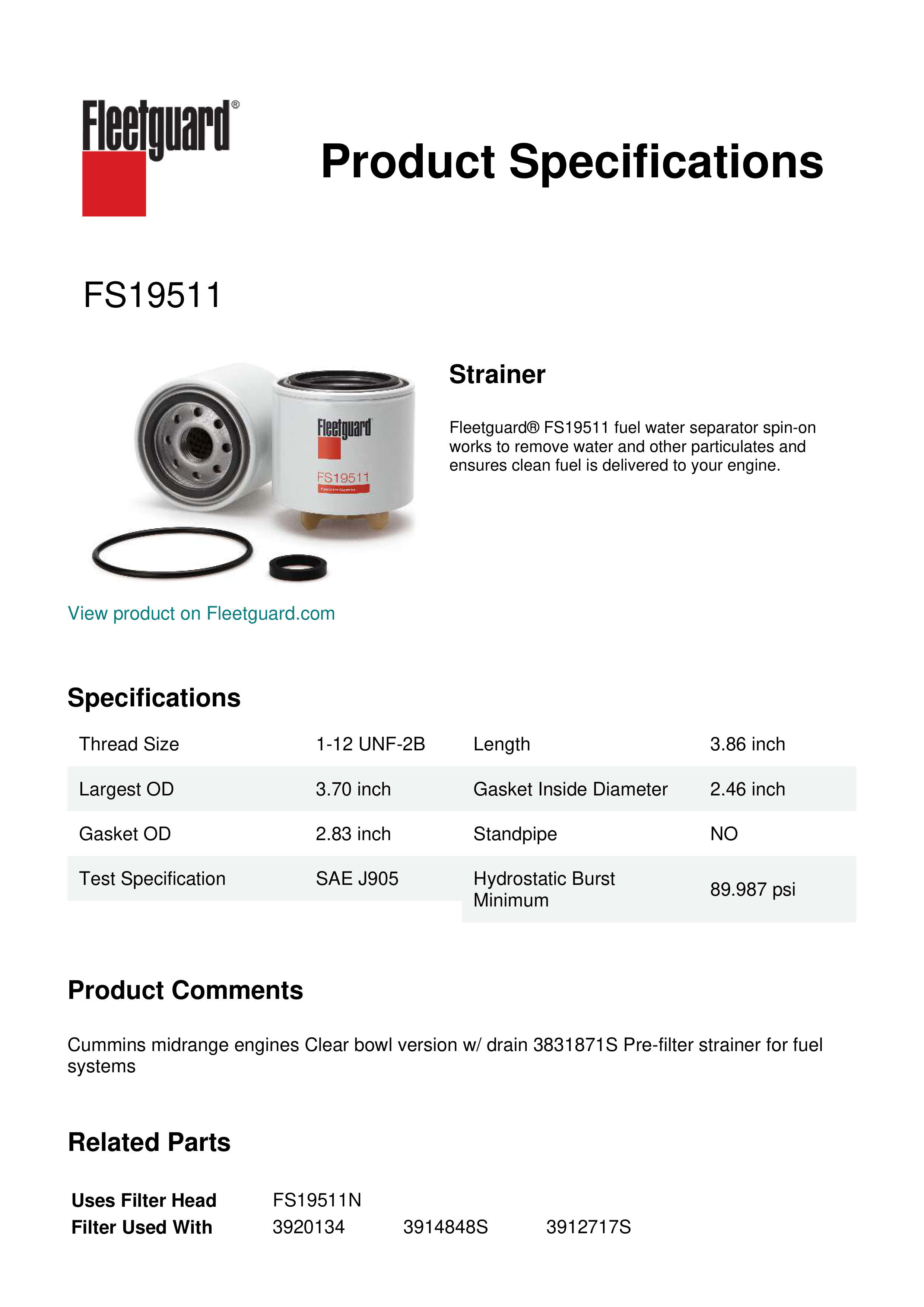 Fleetguard® FS19511 fuel water separator spin-on works to remove water and other particulates and ensures clean fuel is delivered to your engine.Specification