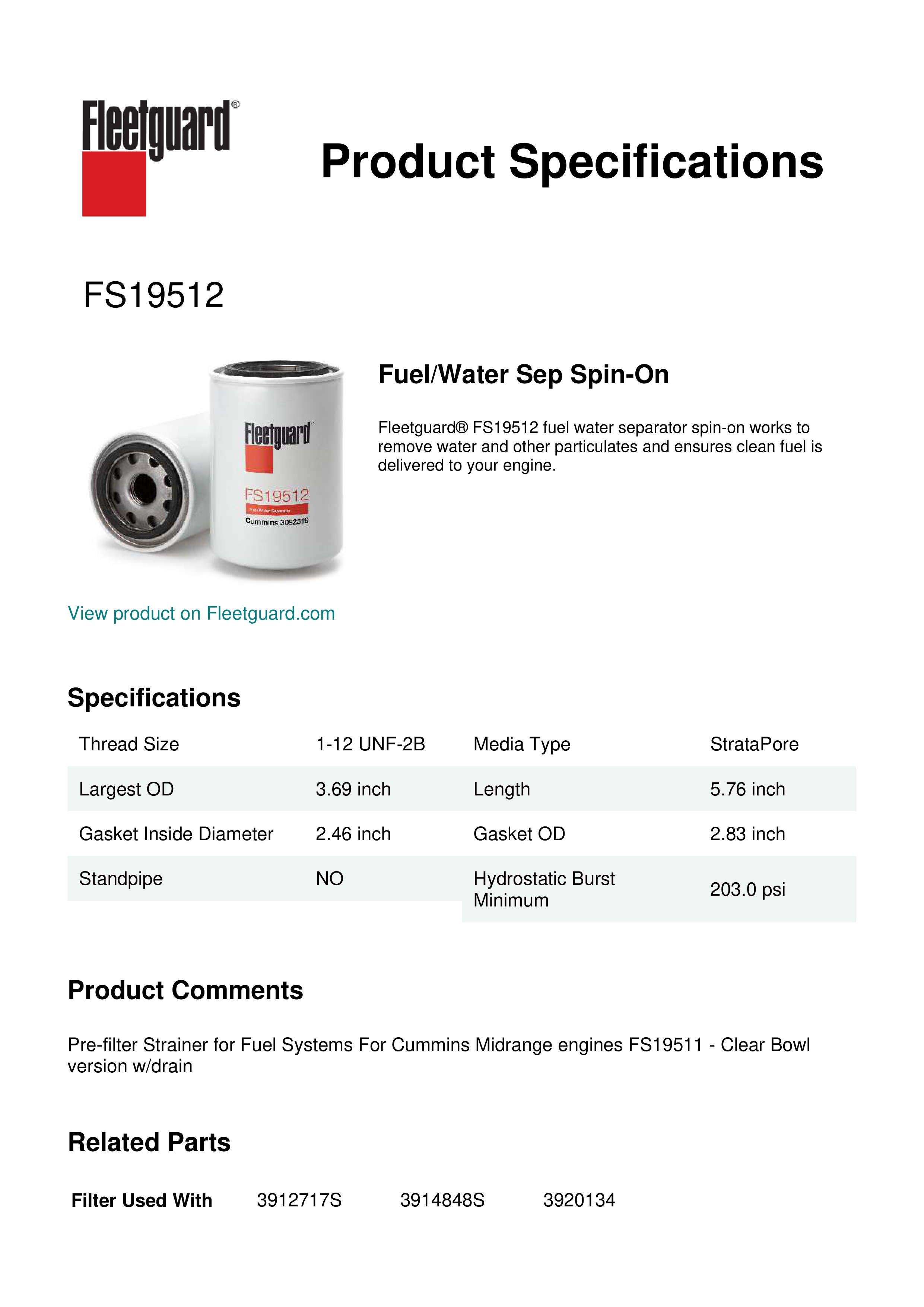 Fleetguard® FS19512 fuel water separator spin-on works to remove water and other particulates and ensures clean fuel is delivered to your engine.Specification