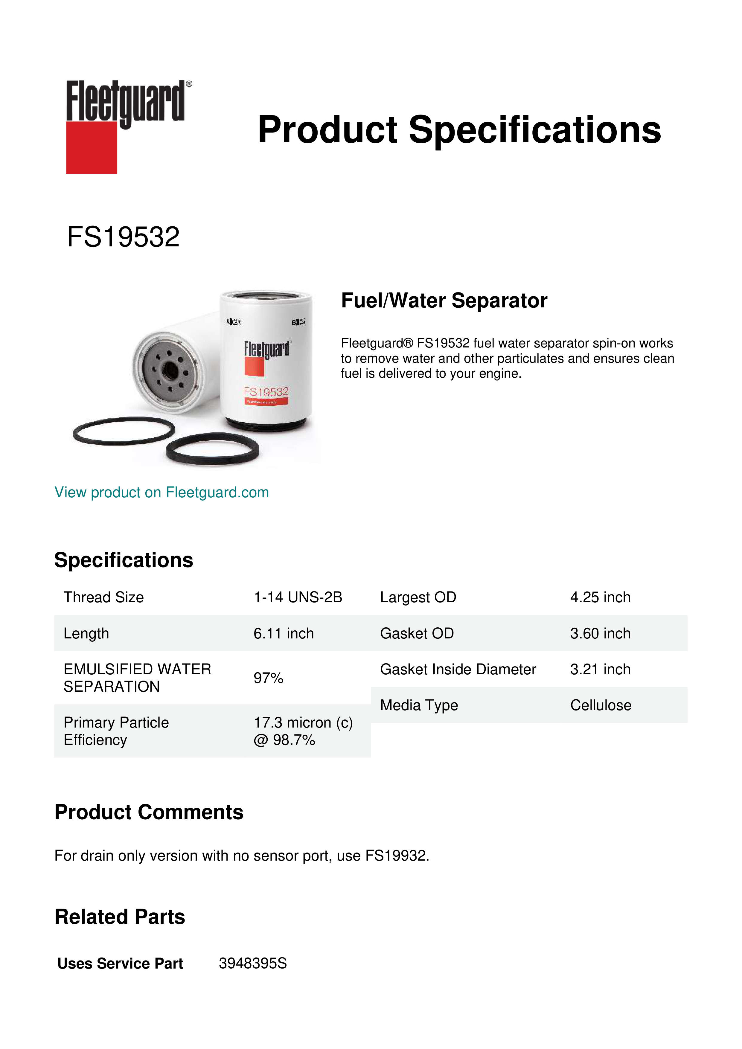 Fleetguard® FS19532 fuel water separator spin-on works to remove water and other particulates and ensures clean fuel is delivered to your engine.Specification