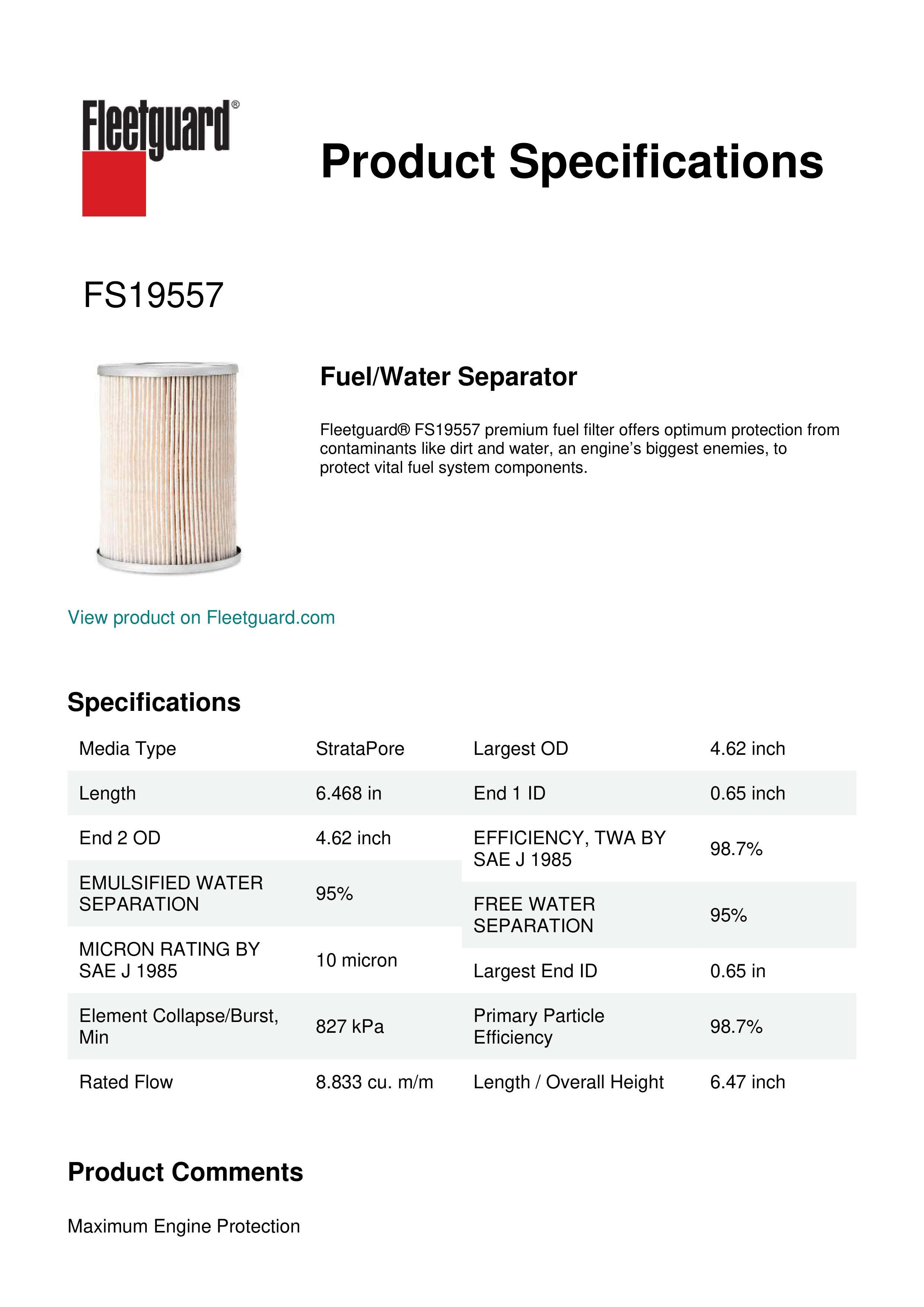 Fleetguard® FS19557 premium fuel filter offers optimum protection from contaminants like dirt and water, an engine’s biggest enemies, to protect vital fuel system components.Specification